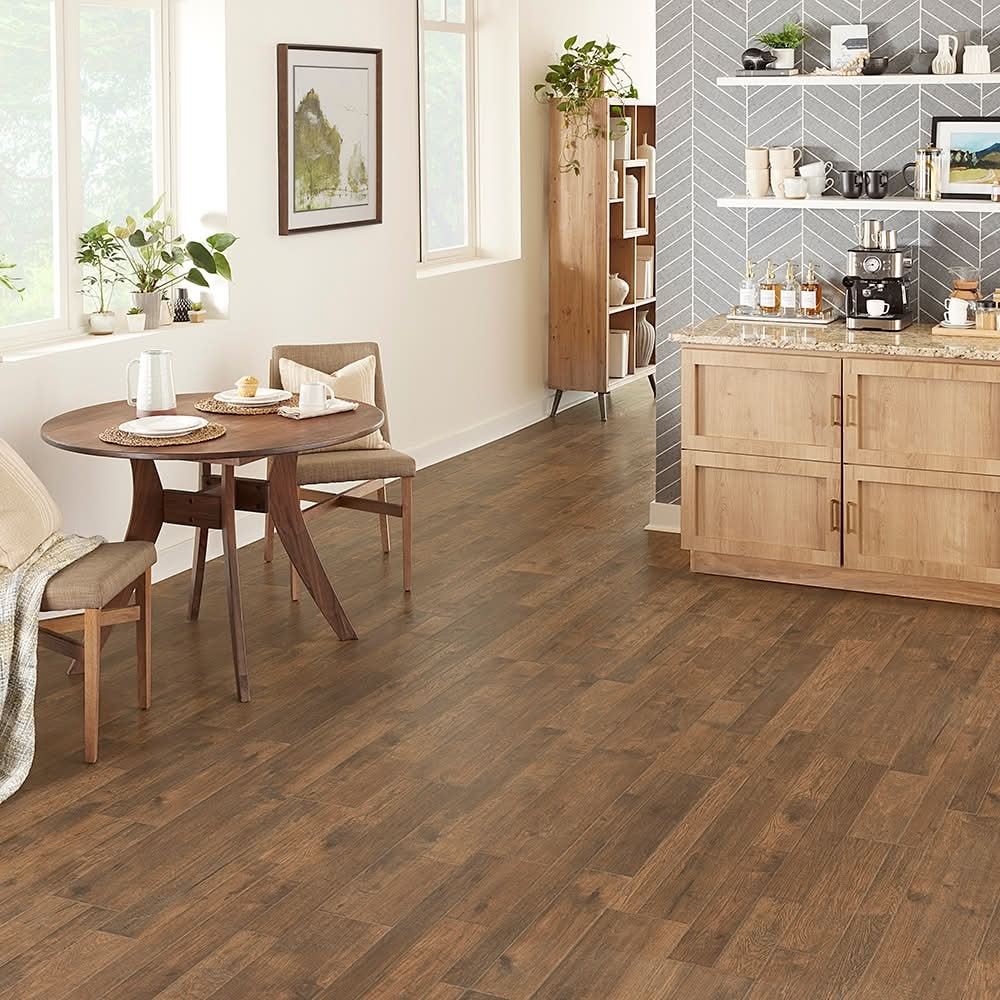 This hickory laminated wood floor recreates an authentic hardwood floor with the look of multiple-width boards and an embossed surface texture. Pergo UltraDef® technology recreates knots, cracks, graining — everything that makes wood unique for the ultimate in realism. Lowe's Project Source floor mouldings for Chester Ridge Hickory are Multi-Transition, 956857 - Qtr Rnd, 956858 - Stairnose, 956859. Pergo floors with WetProtect® technology have a lifetime waterproof surface and subfloor guarantee making them perfect for high-moisture areas like kitchens, baths, laundry rooms, or mudrooms. Guaranteed not to wear, fade or stain with ultimate scratch and dent protection for superior durability. CleanProtect® technology provides antimicrobial properties built in to protect the floor. Easy to install with attached pad and click-lock system saving you time and money. 12 mm total thickness, 10 mm plank + 2 mm attached pad, provides superior stability and a more natural wood floor sound. L For CA Residents Only: WARNING: This product can expose you to chemicals including Lead which are known to the State of California to cause cancer and birth defects or other reproductive harm. For more information go to www.P65Warnings.ca.gov. Color: Brown