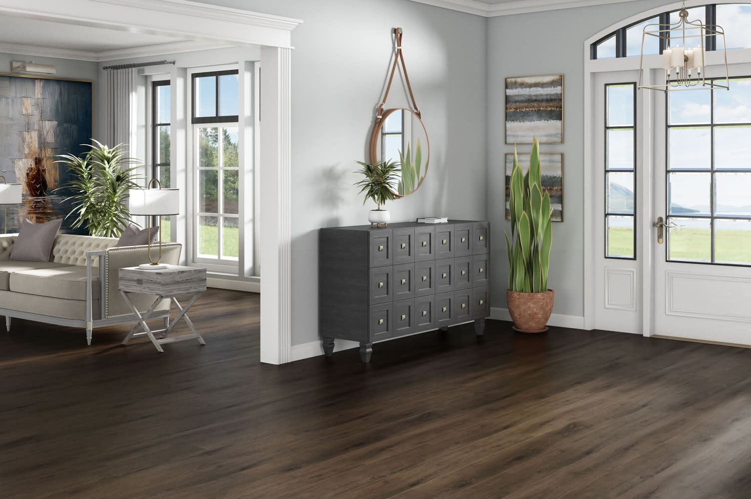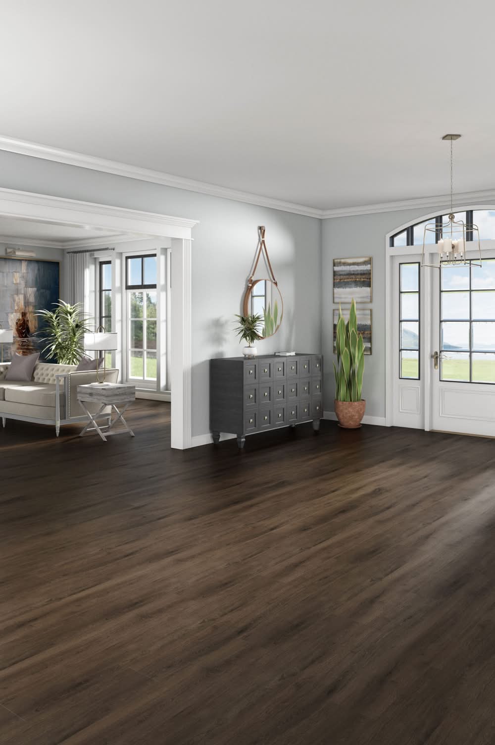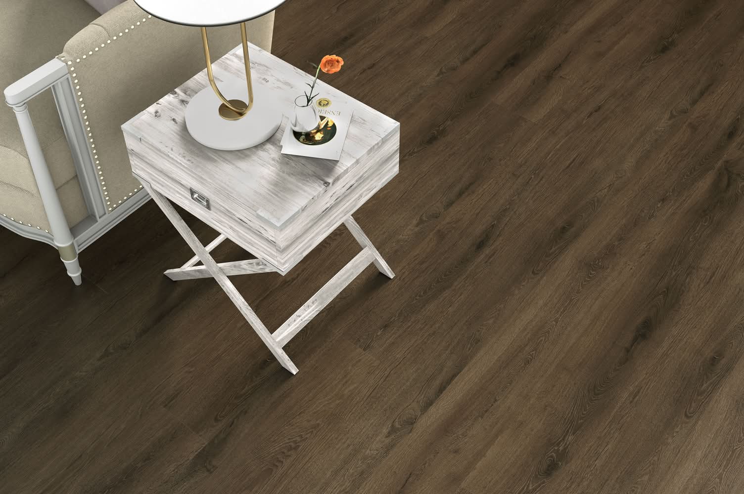 Style Selections Waterproof Luxury Vinyl Plank Flooring is budget-friendly and resistant to scratches and wear—a good choice for bedrooms, living areas, bathrooms & more. Tudor Oak is a brown plank with darker browns throughout the woodgrain and occasional highlights creating a flooring that has depth and dimension. With Click-lock Angle/Drop interlocking planks you can go for a DIY install or opt for Lowe’s professional installation for added convenience. Pre-attached 1mm acoustic padding underlayment offers sound absorption and reduces installation time and cost. Lifetime Residential Limited Warranty & 5-Year Light Commercial Limited Warranty. 7-in W x 47.75-in L x 5mm thick planks cover 23.21 sq ft per carton; 12-mil wear layer; 10 planks per carton; with a carton weight of 39.09 lbs. For matching stair nose & transitional floor mouldings, see Project Source item #s: 5129099, 5129098, 5129100. Use Location: Indoor Color: Brown