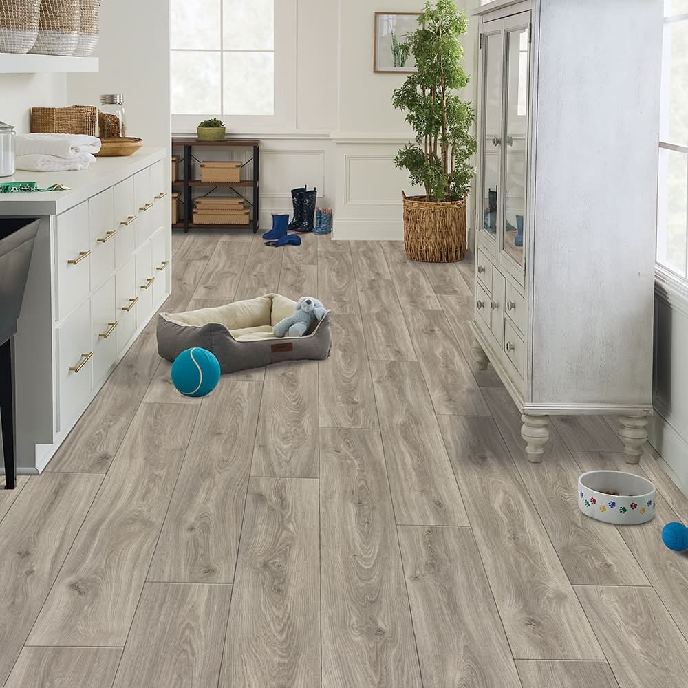 Sophisticated dark gray wood-look with dramatically subtle wood grain designs deliver a striking background for a one-of-a-kind space. Antimicrobial properties are built in to prevent bacteria growth, keeping floors cleaner for longer. Pet-friendly with added protection to guard against scratches, stains and pet accidents. The waterproof performance of vinyl makes this floor a great choice for moisture-prone areas, including kitchens, baths, laundry rooms and basements. 100-gauge thickness is comfortable for standing or walking. Cut to length vinyl in 12-ft widths installs with either loose-lay or a glue-down application so most rooms can be finished in a weekend. Durable, stain-resistant and easy to clean, making it a great choice for active households. FloorScore® Certified and meets or surpasses industry standards for environmental safety. Limited Lifetime Residential Warranty. Color: Gray