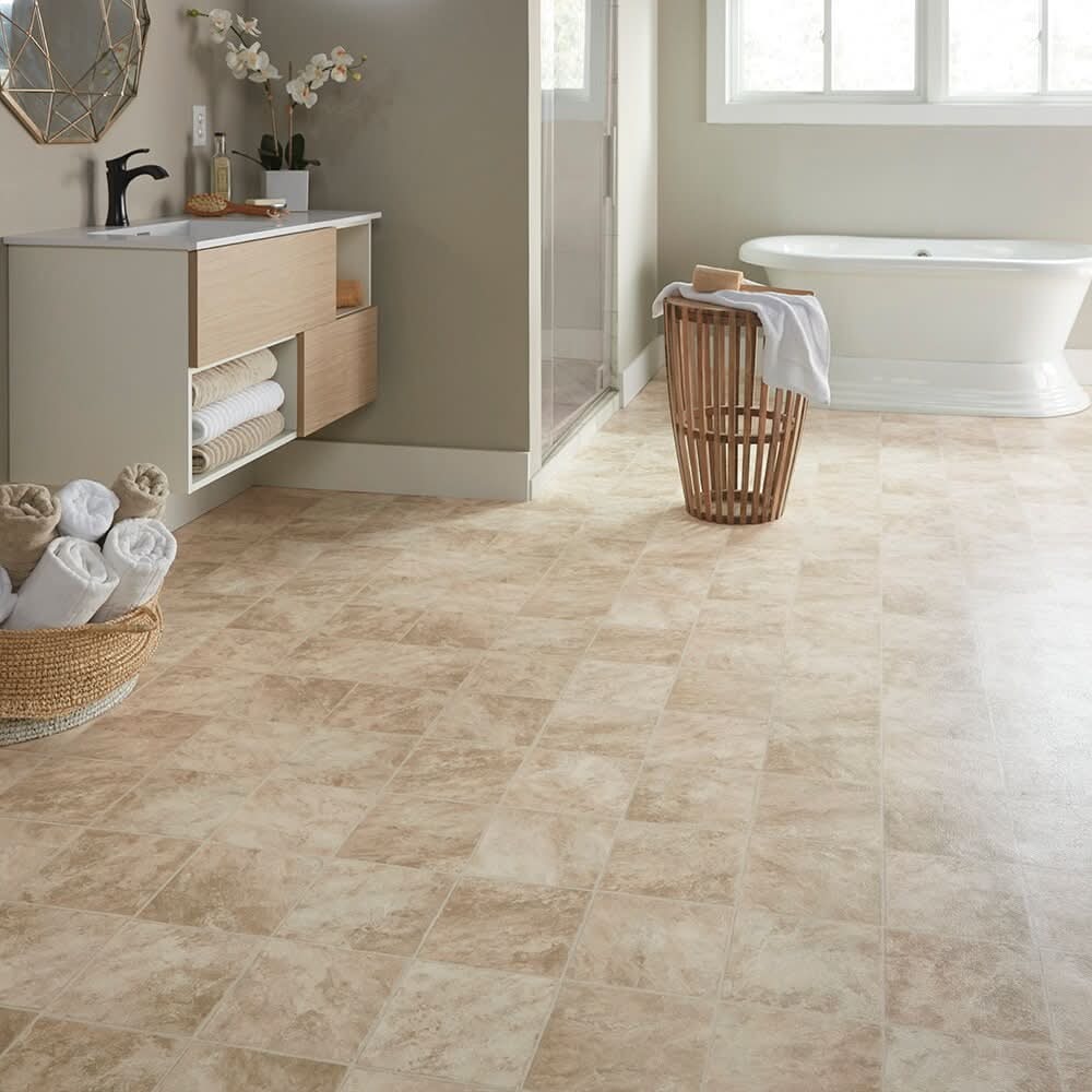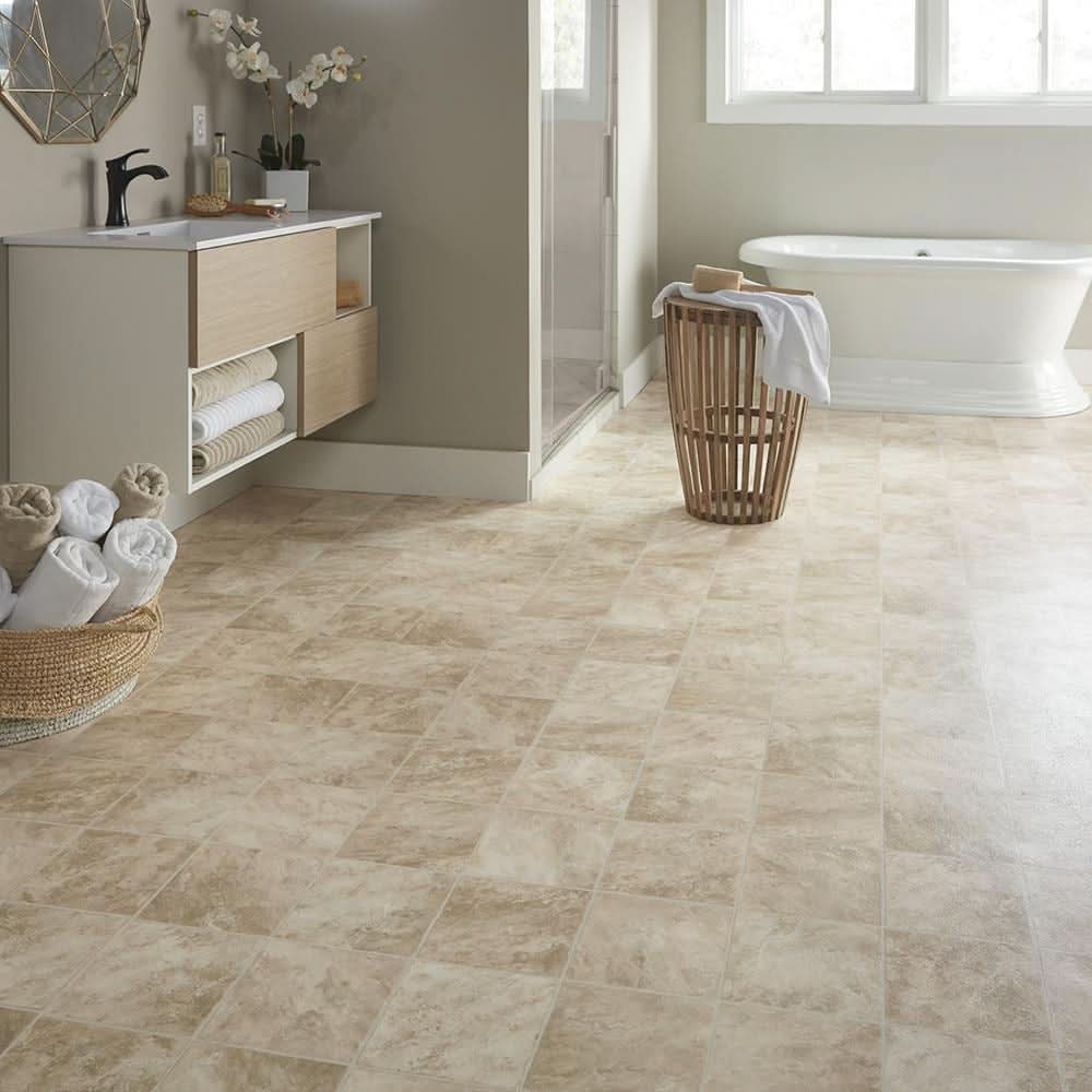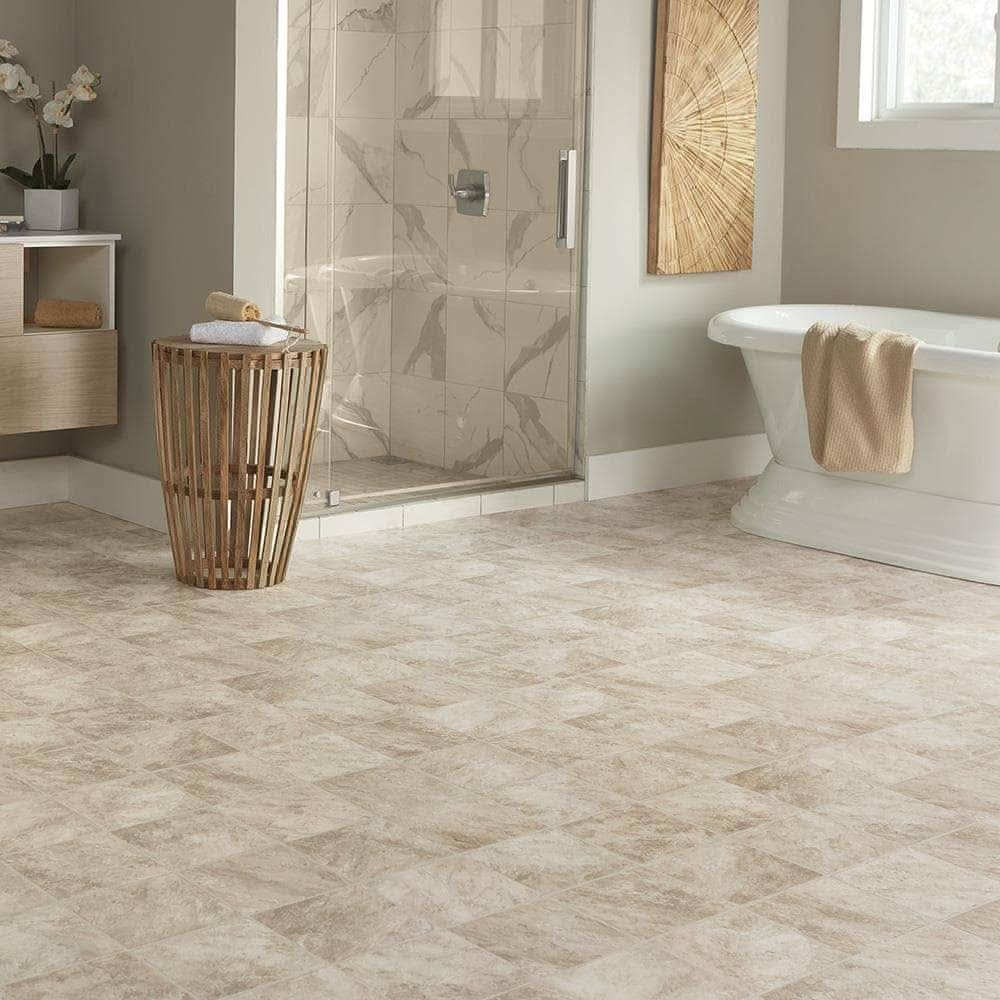 This tile-look vinyl features a blend of pinks, tans and whites for a lighter, softer feeling. Waterproof design is perfect for any moisture prone areas like kitchens, baths, laundry rooms and mudrooms. Installs in any room, including basements. 55-gauge thickness is dent resistant and comfortable underfoot. Cut to length vinyl in 12-ft widths. Fiberglass construction is perfect for a busy home. Easy DIY installation using a loose lay or glue down application. FloorScore® Certified and meets or surpasses industry standards for environmental safety. 15-year Limited Residential Warranty. Color: Off-white