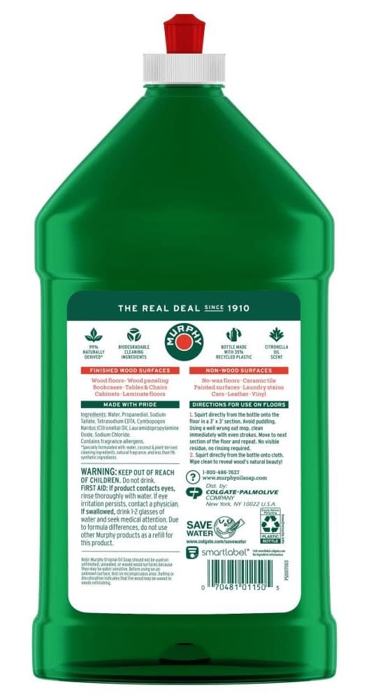 Contains 99% naturally derived ingredients and 100% biodegradable cleaning ingredients. (Specially formulated with water, coconut and plant-derived cleaning ingredients, natural fragrance, and less than 1% synthetic ingredients.). Citronella Oil Scent. Finished Wood Surfaces: Wood floors; Cabinets; Tables and chairs; Wood paneling; Laminate floors; Bookcases. Non-Wood Surfaces: No-wax floors; Ceramic tile; Painted surfaces; Laundry stains; Cars; Vinyl. Packaging: Reusable