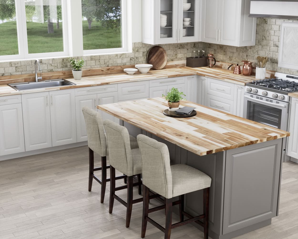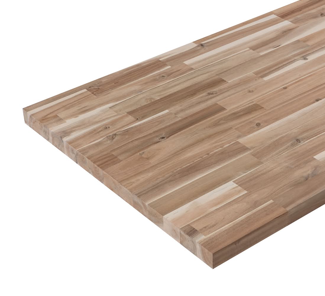 Made from solid wood FSC® Acacia. Ready for your preferred stain and final finish. Actual dimensions: 48-in x 25-in x 1.5-in. Perfect for counters, desks, islands, tables, work benches and more. Can be cut for use with a sink - be sure to carefully seal all surfaces and edges from moisture. Each countertop is unique with naturally occurring variations in color, grain patterns and the organic features of real Acacia. Must be sealed with a wood sealer on top, bottom and all edges to protect from moisture gain or loss. Color: Brown