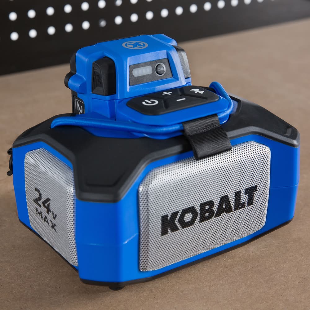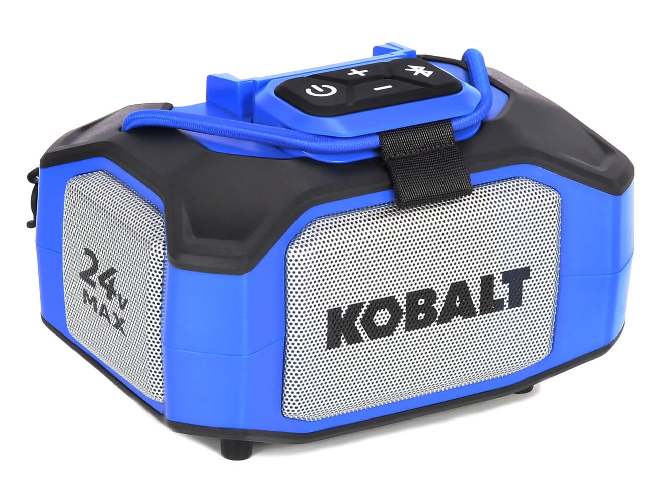 The Kobalt 24-volt max bluetooth speaker is rugged, yet compact, for portability. USB port for charging cell phones or other electronic devices. Auxiliary jack for direct connection. Kobalt's 5-year warranty gives you peace of mind. Compatible with all Kobalt 24-volt max batteries and chargers (sold separately). Use Location: Outdoor Color: Blue