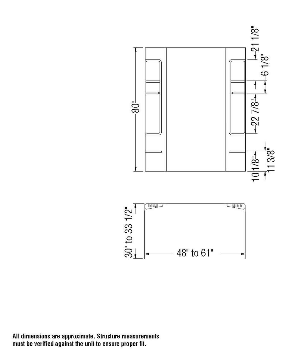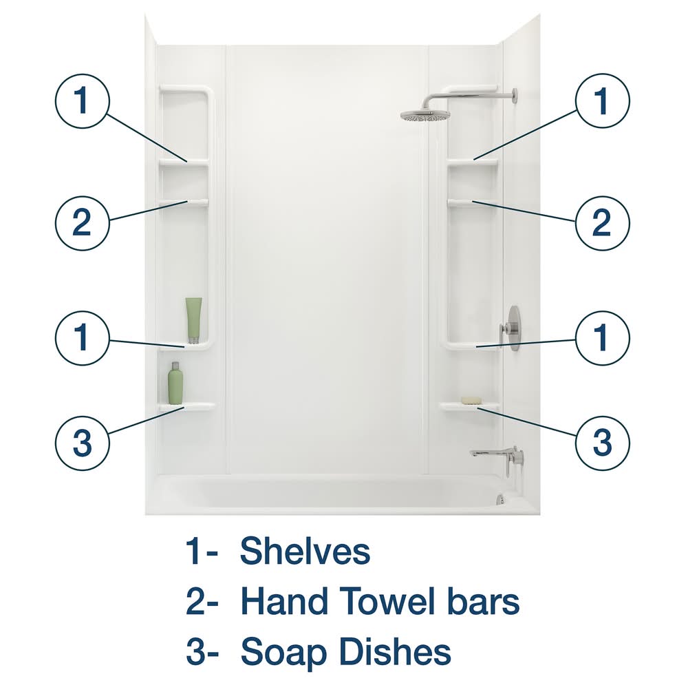 MAAX Lenoir was formally called the Mansfield Callahan. 5-piece extended height (80-inches) wall surround set is versatile and can be installed in both bathtub and shower applications, providing a seamless and cohesive look for your bathroom. Includes six integrated shelves for ample, large bottle storage and other bath essentials. Tub Wall Surround includes: 1 back panel, 2 corner panels and 2 side panels. Can be cut to size to accommodate any shower space that fits a length of 48-in to 61-in and a width of 30-in to 34-in. Back panel can be cut for a window opening. Bright, glossy polystyrene, not only gives your bathroom a polished look, but also makes it easy to clean and maintain. Lightweight and easy to handle makes it simple for one person to install without the need for special equipment or assistance.. Install to water-resistant drywall, do not install panels over existing ceramic tile or plywood.. For CA Residents Only: WARNING: This product can expose you to chemicals including Lead which are known to the State of California to cause cancer and birth defects or other reproductive harm. For more information go to www.P65Warnings.ca.gov. Color: White