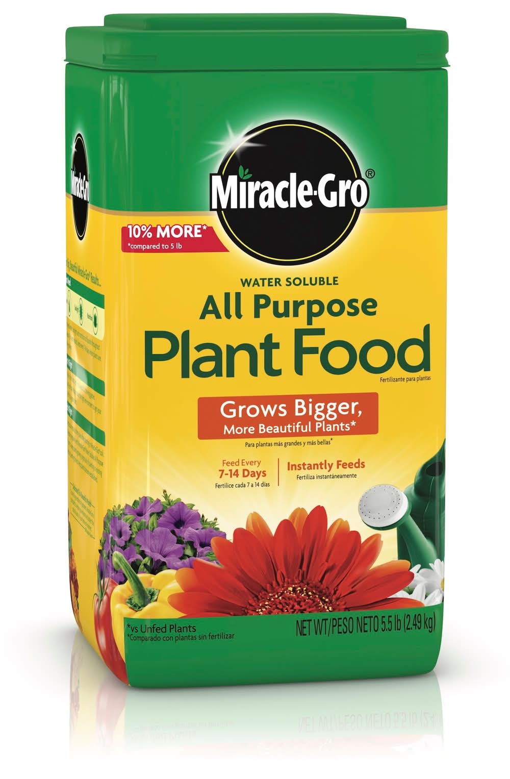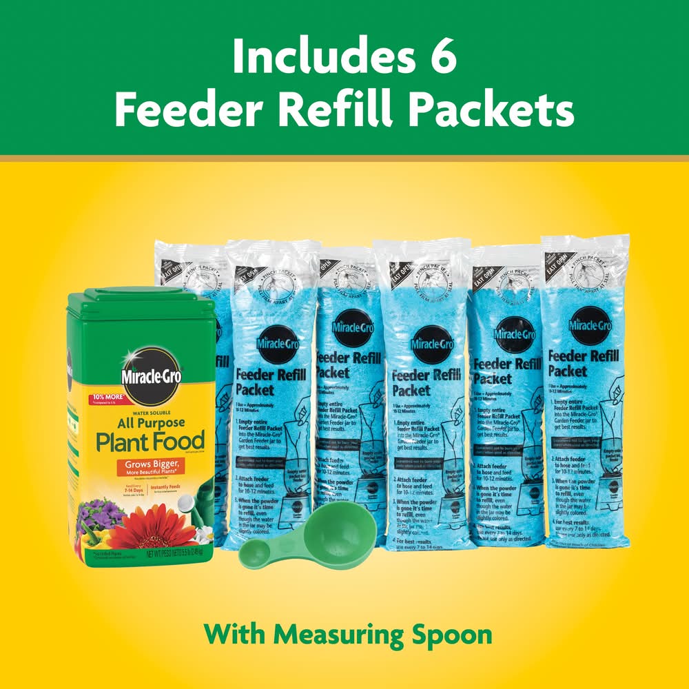 Miracle-Gro® Water Soluble All Purpose Plant Food grows bigger, more beautiful plants (vs unfed plants). This all-purpose plant food starts working instantly and promotes quick, beautiful results. Use this gardening product with any plant type, including flowers, vegetables, houseplants, roses, trees, and shrubs, whether in-ground, in containers, indoors or outdoors. To use with indoor plants, mix 1/2 tsp per gallon of water in a watering; For outdoor plants, mix 1-1/2 tbsp per 1-1/2 gallon of water. One 5.5 lb container of Miracle-Gro® Water Soluble All Purpose Plant Food feeds approximately 2,200 sq ft of garden area. Use Location: Indoor/Outdoor