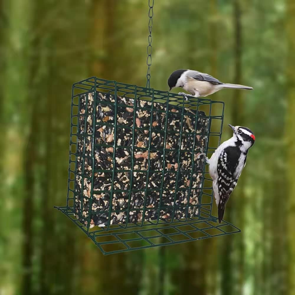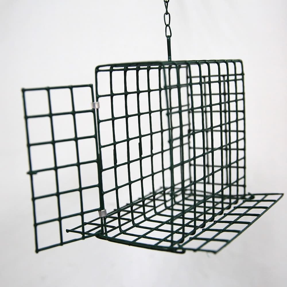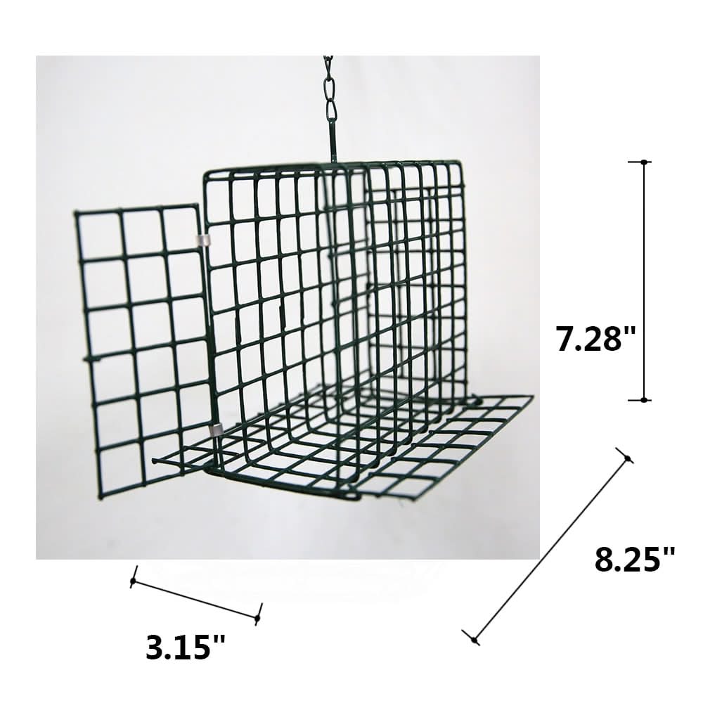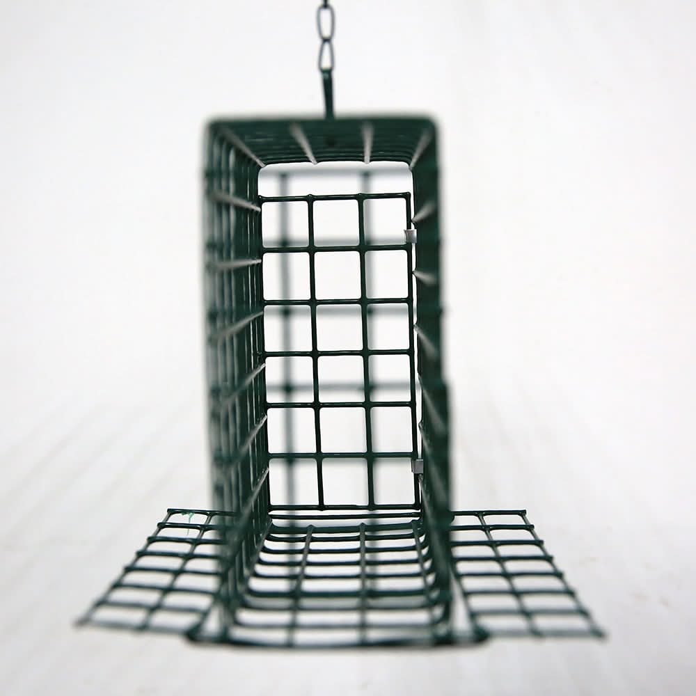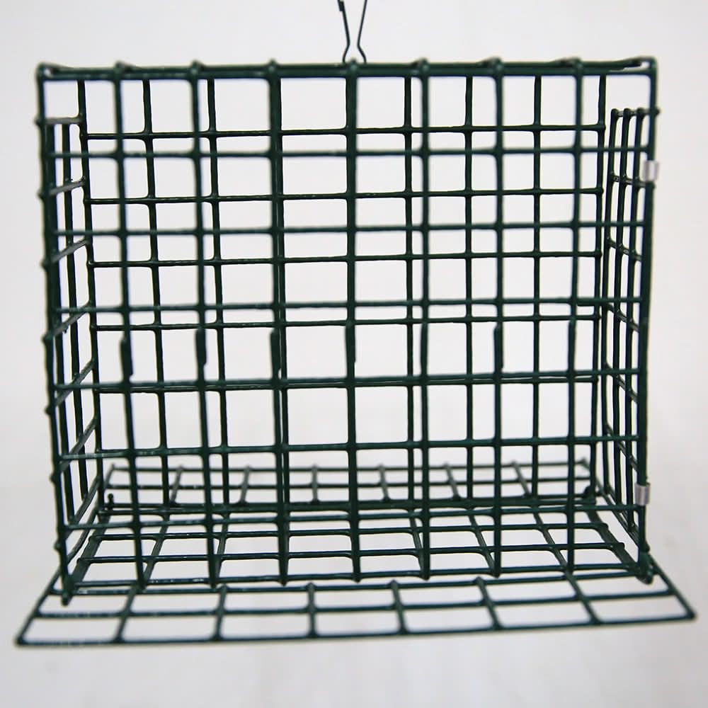 Wire basket dipped in plastic includes chain for hanging. Convenient and easy to use. Holds one suet or seed cake. Suet not included. Easy to assemble. Color: Green