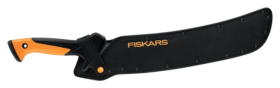Fiskars Machete offers a better way to tame the fast-growing vegetation in your yard and garden, especially when clearing large areas with wide swings. 15" blade is ideal for clearing large areas of brush, cutting thick branches, powering through fibrous palms and more in your yard and garden. Curved blade profile helps prevent the blade from sticking in dense growth. One-handed use leaves your other hand free to grab and pile cuttings, unlike other tools that require a two-handed grip. Rust-resistant, low-friction coating glides through tough materials without sticking. Extended grip lets you pinch closer to the blade for added control when making precision cuts. Features a nylon carrying sheath and finger guard that offers protection for safe use. The texture pattern on handle features large dimples where fingers rest for grip and small dimples where the palm rests to help prevent blisters. Backed by the Fiskars Guarantee, we stand behind every product and are proud to include a Limi