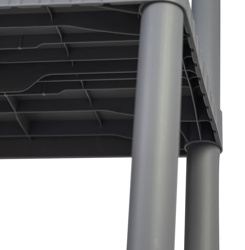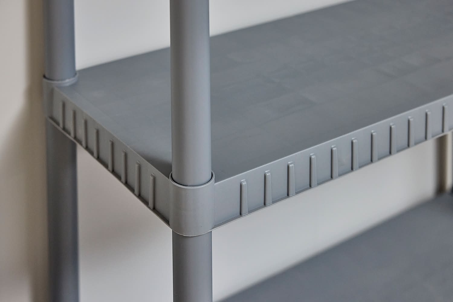 Durable- design allows hold 50lbs per shelf and easily fit the Project Source Clear 15G tote. Easy assembly- build your Project Source 4-teir shelf in an average of 10 minutes. Solid shelving- the solid shelves allow you to store smaller items without worrying about if they will fall through. Made for indoor or outdoor use. Plastic construction will not rust, stain, peel, or dent. Durable plastic construction that resists moisture. 14.62” D x 34.75” W x 52.06” H | 31.25” W between poles | 14.5” H in-between shelves. Reusable and recyclable. Made in the USA. Color: Gray