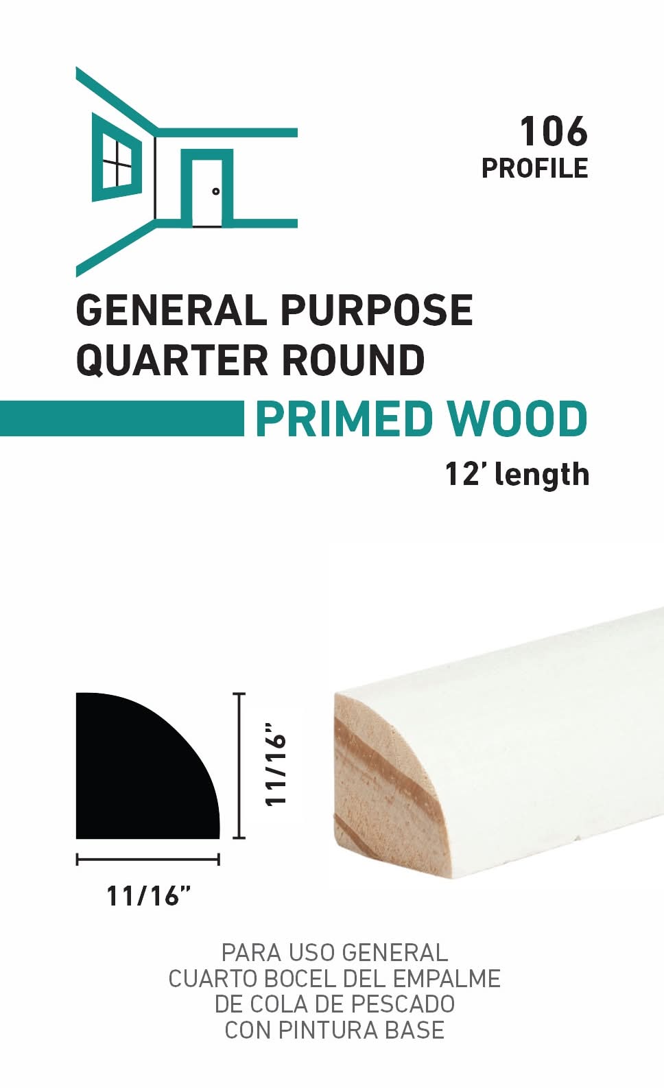 RELIABILT 106 profile quarter round moulding is made from solid finger-joint pine. Primed white and ready to install and paint your choice of color. Each piece has actual dimensions of 11/16-in thick x 11/16-in wide x 12-ft long. Create a finished look with RELIABILT quarter round mouldings anywhere you need to hide a seam or provide a rounded touch to a board or moulding build up, works great to decoratively cover gaps between windows, doors jambs, floors and the wall. Economical finger joined pine mouldings have been manufactured to be strong, defect free, and usable from end to end. Great solution for various other home projects, crafts, hobbies, and moulding applications. Add value, style, and enjoyment to your home by coordinating with your baseboard, case, and crown moulding. Cuts and installs with common wood working and power tools, secure with finishing nails or brads. Recommended for interior applications only. For CA Residents Only: WARNING: This product can expose you to chemicals including Lead which are known to the State of California to cause cancer and birth defects or other reproductive harm. For more information go to www.P65Warnings.ca.gov. Color: White