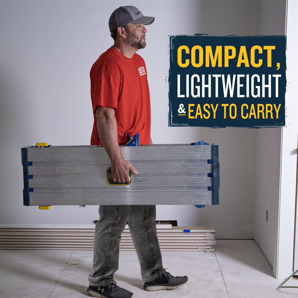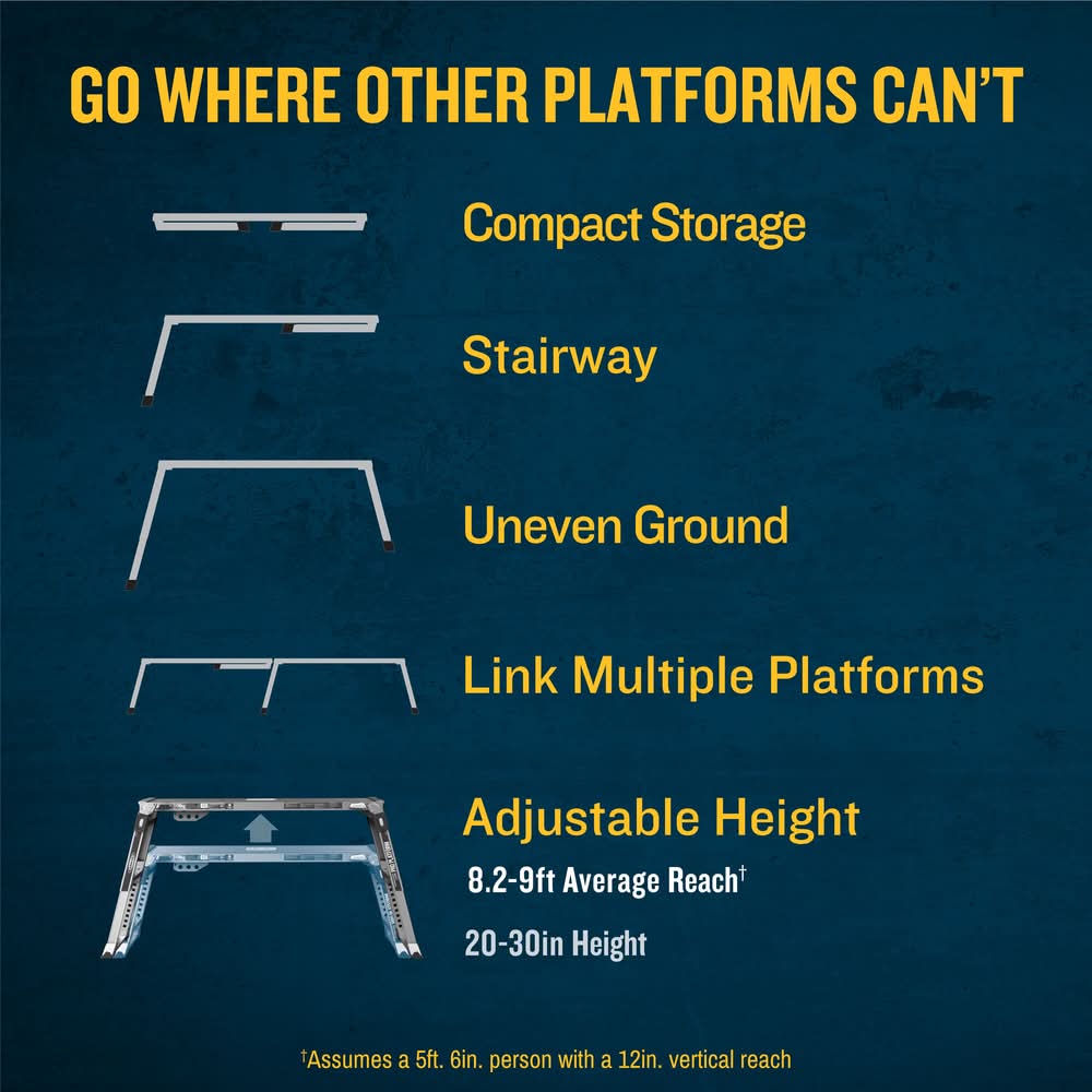 47in x 14in platform provides a wide standing platform. Work platform adjusts from 20in to 30in high providing a 8ft to 9ft reach height. Quick Link technology allows for 2 or more platforms to be linked with no tools required. Wide feet provide stability without the need for manual adjustment. Height adjustment allows the work platform to be set on stairways. Quick set up with one handed lock and height adjustments. The compact size, light weight, and EASY-GRAB handles make it simple to carry your work platform quickly and safely. Dual self-locking legs securely lock when opened for safety and lock again when closed for easy transport and storage - Locks in BOTH the open and closed positions. Dimensions of single work platform in the closed position: 47in length, 20in width, 4.2in high, 23 lb weight. Use Location: Indoor Color: Silver