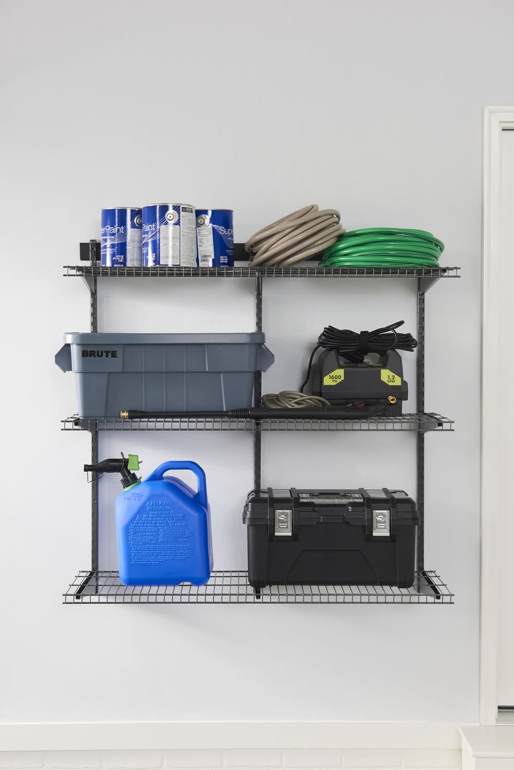 Requires FastTrack uprights for installation (model 1784365 or 1784367). Durable, powder-coated steel construction resists rusting, chipping and cracking. Ideal for storing large, heavy items, perfect for garage or workroom areas. Includes speed clips to lock wire shelf in place and allow for quick removal of wooden shelf for repositioning. Made with strong metal with a nickel finish. 3 brackets hold up to 350 pounds using 4 per shelf. Includes (1) Rubbermaid FastTrack Shelf Bracket with Speed Clips. Lifetime limited warranty. Color: Silver