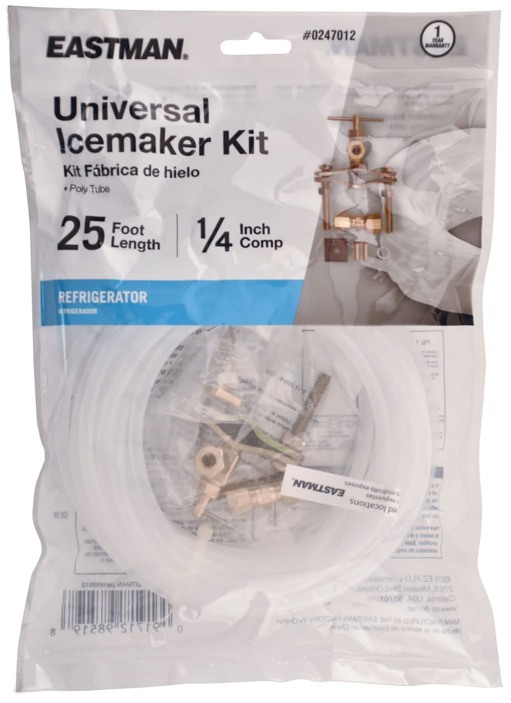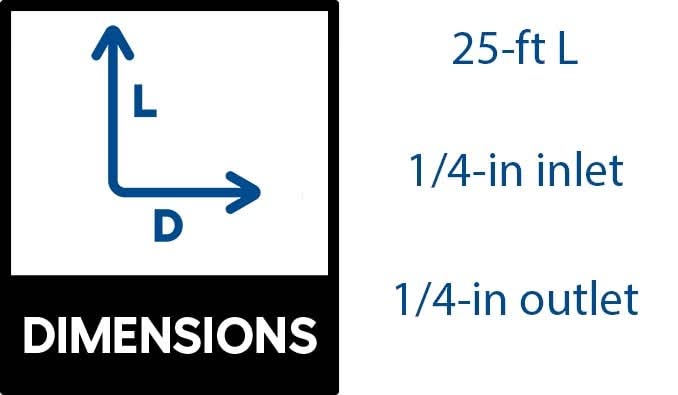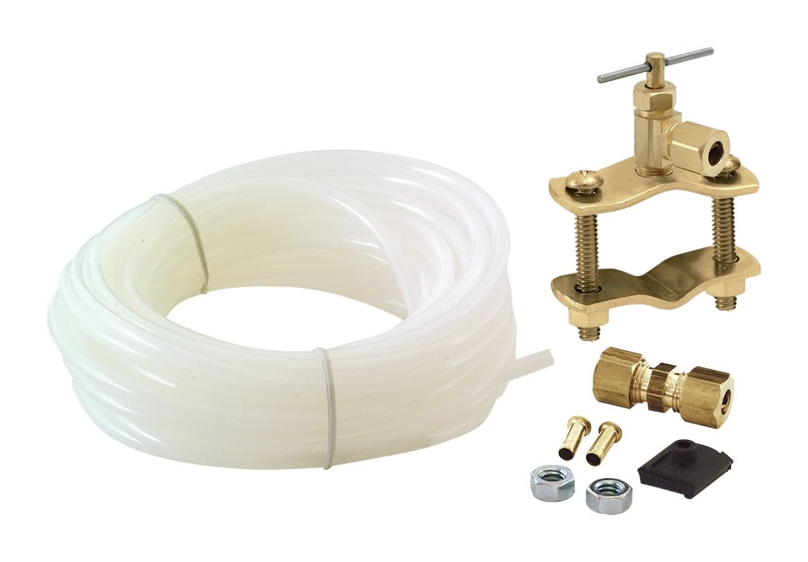 Constructed from durable polyethylene tubing for flexibility and long-lasting performance.. Self-piercing brass saddle valve allows for easy tapping into copper water pipes without shutting off the water supply.. Compatible with 1/4-inch OD water lines and most major appliance brands.. Certified lead-free and NSF-compliant for product safety and potable water use.. Universal kit designed to fit most major appliance brands for easy compatibility.. Includes a 25-ft x 1/4-in (1/6-in ID) polyethylene tube, a 1/4-in compression brass union, and a self-tapping brass saddle valve with a 1/4-in compression outlet.. Withstands a working pressure of 125 PSI with a burst pressure of 200 PSI for safety and reliability.. Engineered to perform within a temperature range of 15°F to 158°F.. Backed by a 1-year warranty for reliable performance and peace of mind.. For CA Residents Only: WARNING: This product can expose you to chemicals including Lead which are known to the State of California to cause cancer and birth defects or other reproductive harm. For more information go to www.P65Warnings.ca.gov.