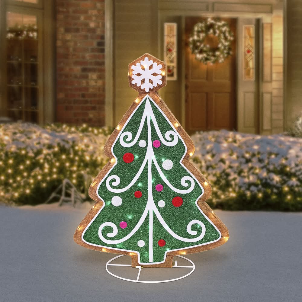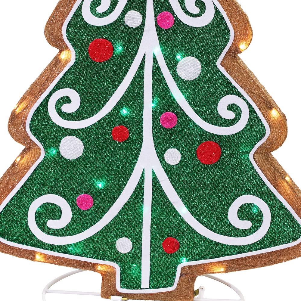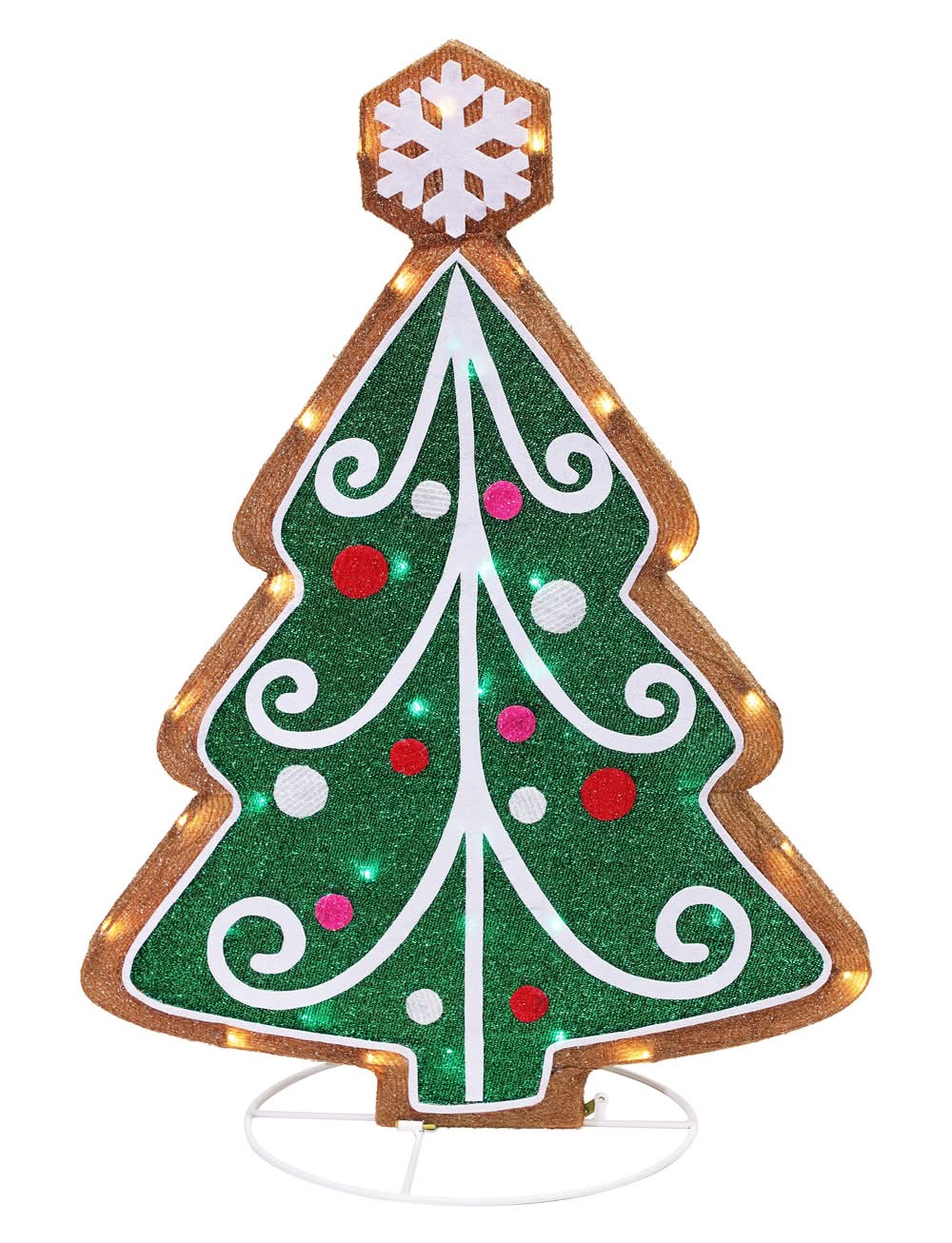 3-ft x 2.2-ft Indoor/Outdoor Lighted Gingerbread Cookie Tree. 40 Green and Warm White Twinkling LED lights. Quick and easy assembly for hassle-free decorating. Can be used indoors or outdoors. Includes spare bulbs and metal stakes for anchoring to the ground. Easily breaks down into smaller pieces for convenient storage. Electrical outlet required to plug in; 6-ft power cord for easy operation. Use Location: Indoor/Outdoor Color: Multiple colors/finishes