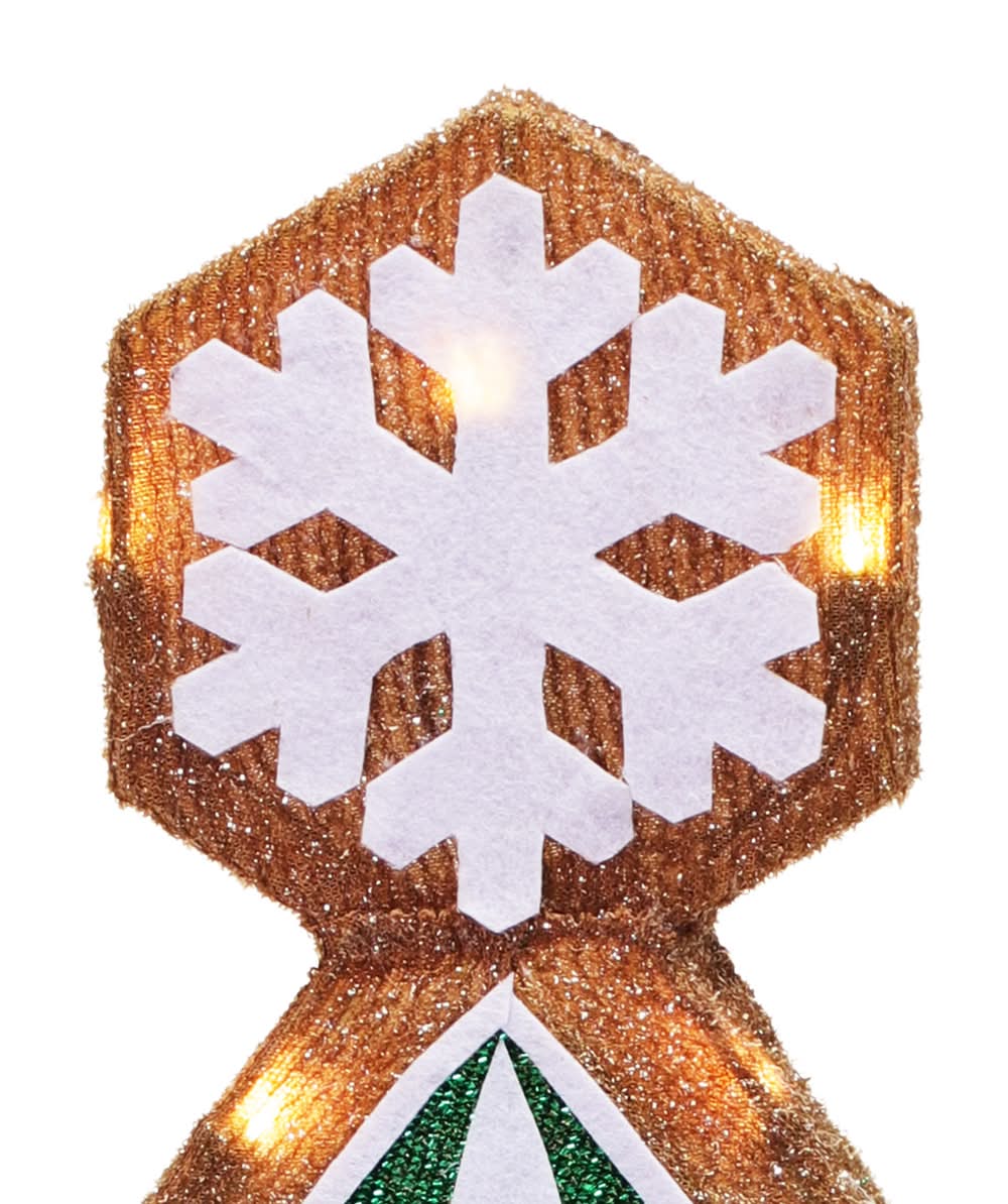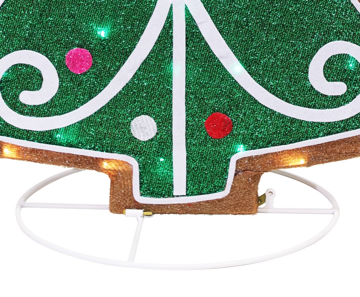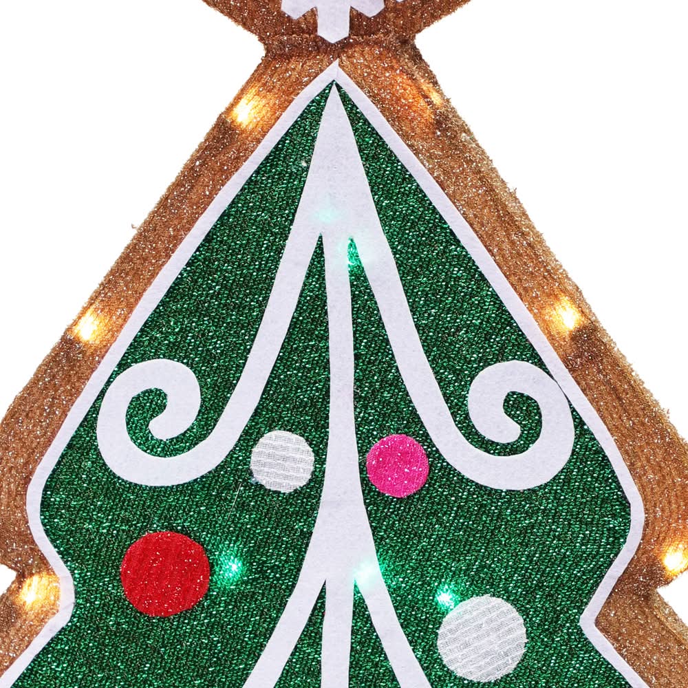 3-ft x 2.2-ft Indoor/Outdoor Lighted Gingerbread Cookie Tree. 40 Green and Warm White Twinkling LED lights. Quick and easy assembly for hassle-free decorating. Can be used indoors or outdoors. Includes spare bulbs and metal stakes for anchoring to the ground. Easily breaks down into smaller pieces for convenient storage. Electrical outlet required to plug in; 6-ft power cord for easy operation. Use Location: Indoor/Outdoor Color: Multiple colors/finishes