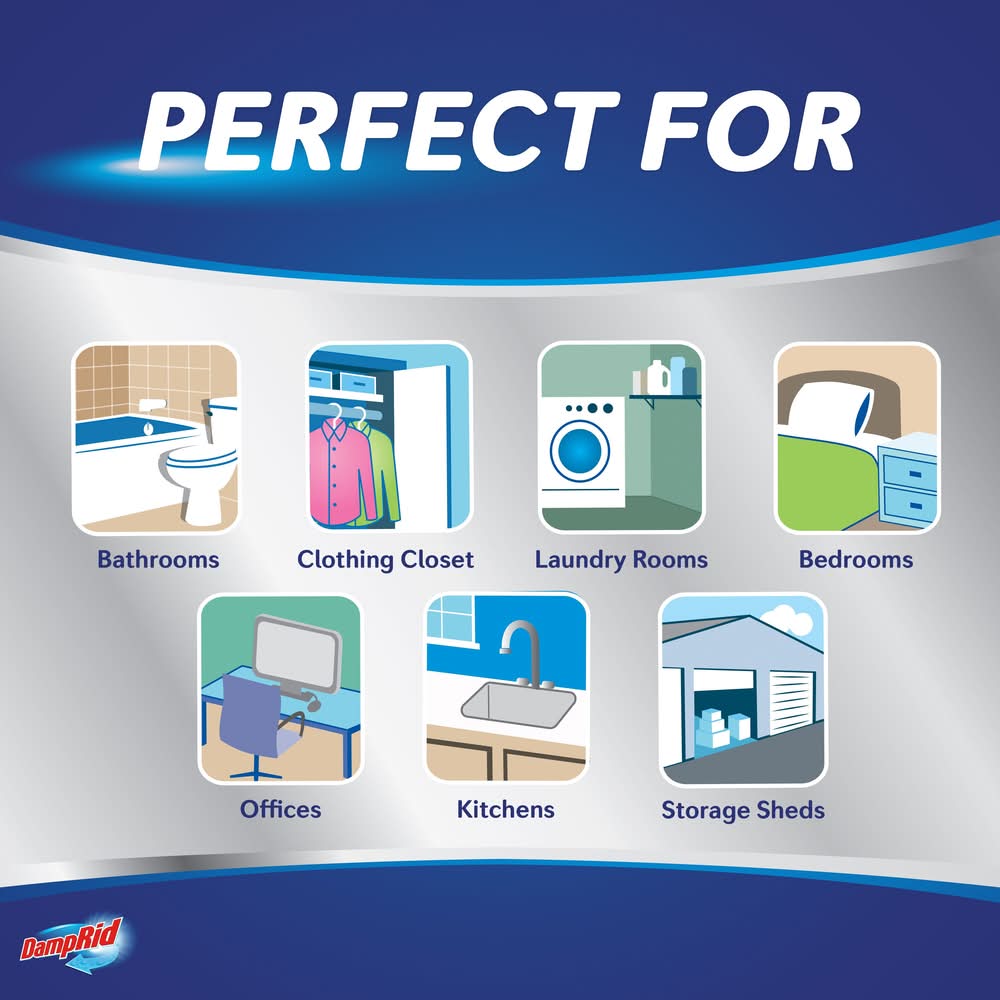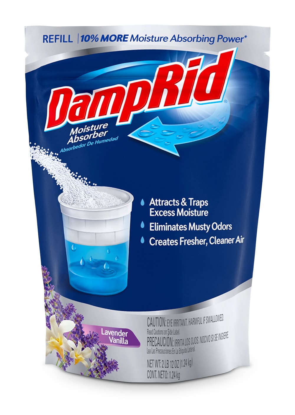 Traps excess moisture and eliminates musty odors. 10% More moisture absorbing power compared to 10.5 oz cup. Contains 4 refills, each lasting up to 45 days depending on temperature and humidity. Don't just cover up odors, eliminate them with DampRid lavender vanilla moisture absorbers, attracts and traps excess moisture and eliminates musty odors, packaged in a 44-ounce refill bag. Cost effective moisture control economical refills are a cost-effective way to maintain continuous moisture control. Longer lasting: DampRid refill bags offer 10% more moisture absorbing power, each refill is 10% more compared to 10.5 oz cup, each refill lasting up to 45 days depending on temperature and humidity. Watch DampRid work as it attracts and traps excess moisture out of the air, creating fresher, cleaner air. Easy to use: when the DampRid container is full of water, just pour the liquid out and refill with more calcium chloride crystals. Great for use in bathrooms, laundry rooms, kitchens and any s