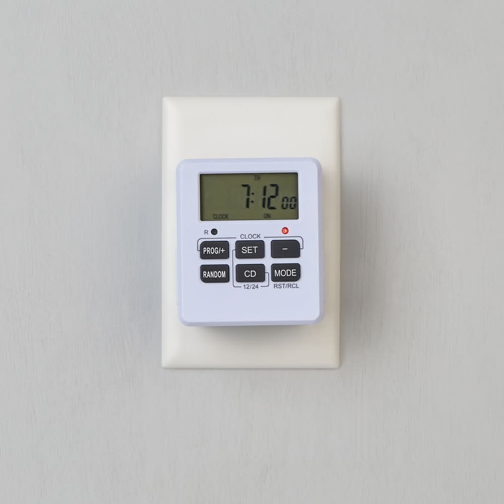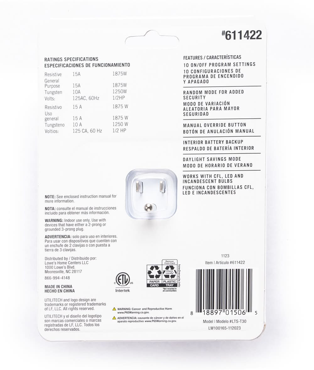 Battery backup inside. Works with CFL , LED and incandescent bulbs. 10 ON/OFF program setting. For use with indoor lighting and decorations. Use Location: Indoor For CA Residents Only: WARNING: This product can expose you to chemicals including Lead which are known to the State of California to cause cancer and birth defects or other reproductive harm. For more information go to www.P65Warnings.ca.gov. Color: White