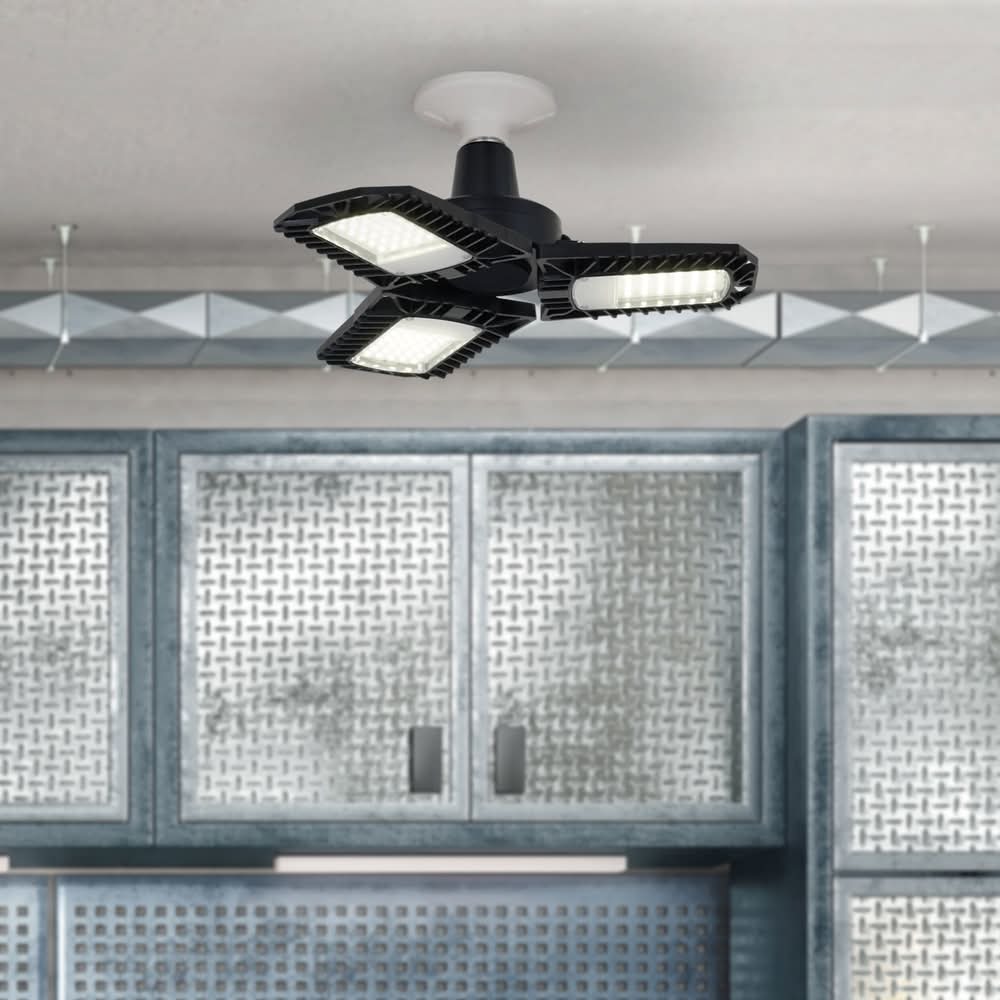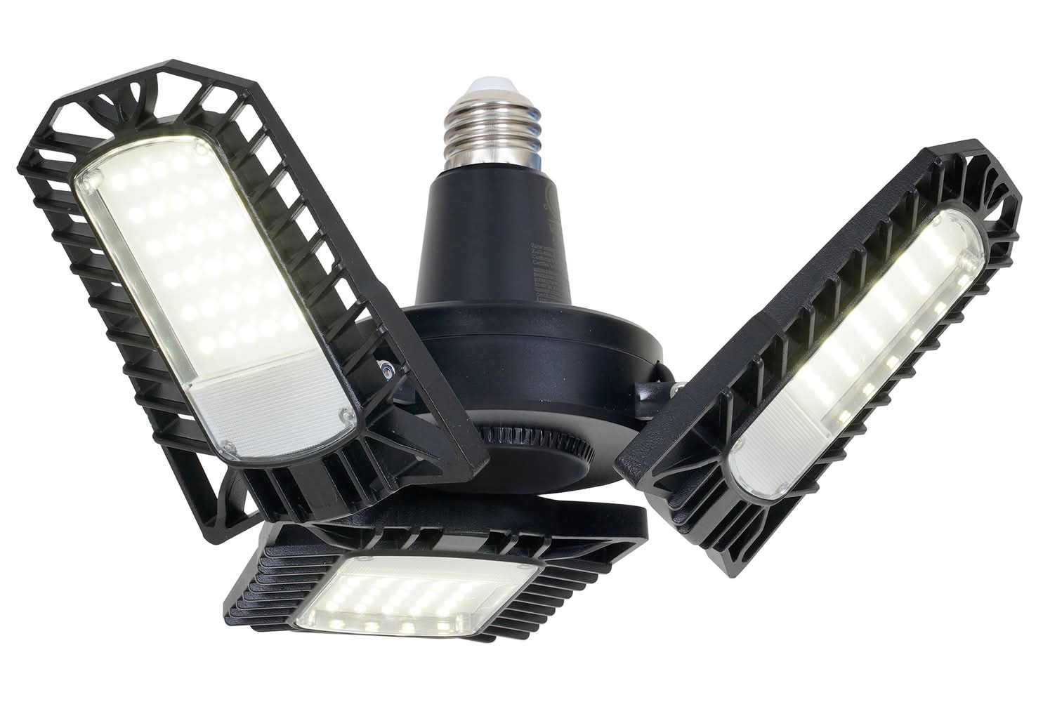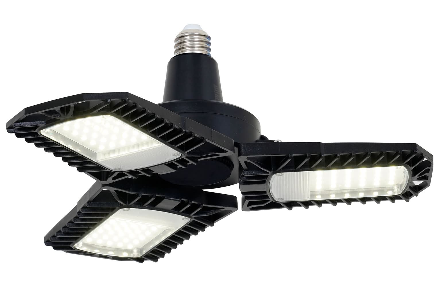 80-watt LED 3-panel garage light. 8000 lumens of brightness. 5000K temperature provides a cool and bright light, similar to natural daylight.. With a lifespan of 50,000 hours, you can rest assured that replacements won't be necessary frequently.. The light can adapt to different lighting requirements by rotating vertically up to 90 degrees. With an E26 medium base, the light installs easily in standard fixtures.. For indoor use. ETL rated for damp location installation. For CA Residents Only: WARNING: This product can expose you to chemicals including Lead which are known to the State of California to cause cancer and birth defects or other reproductive harm. For more information go to www.P65Warnings.ca.gov. Color: 5000