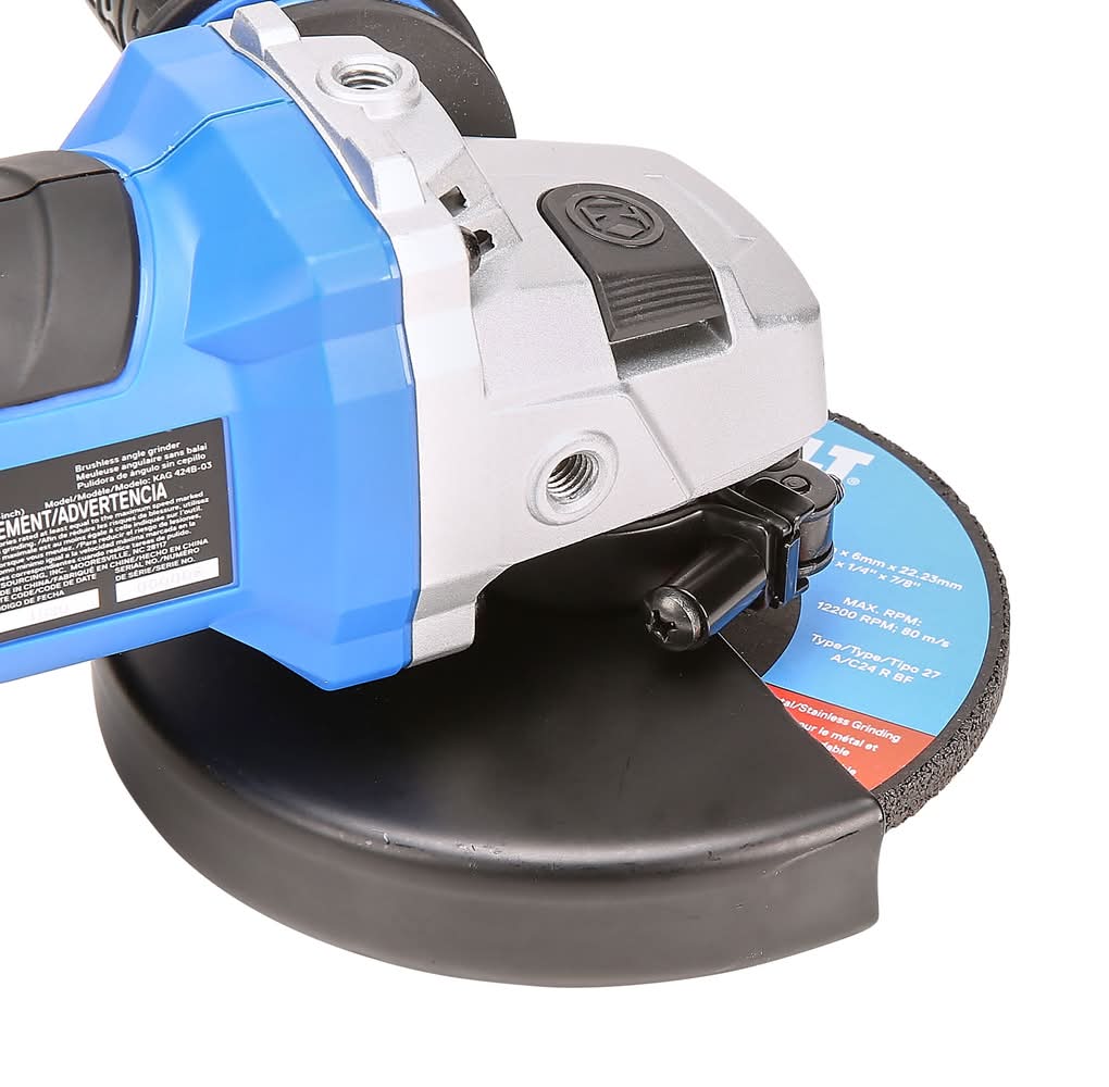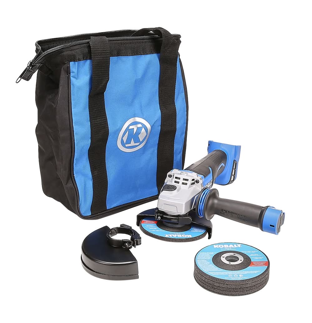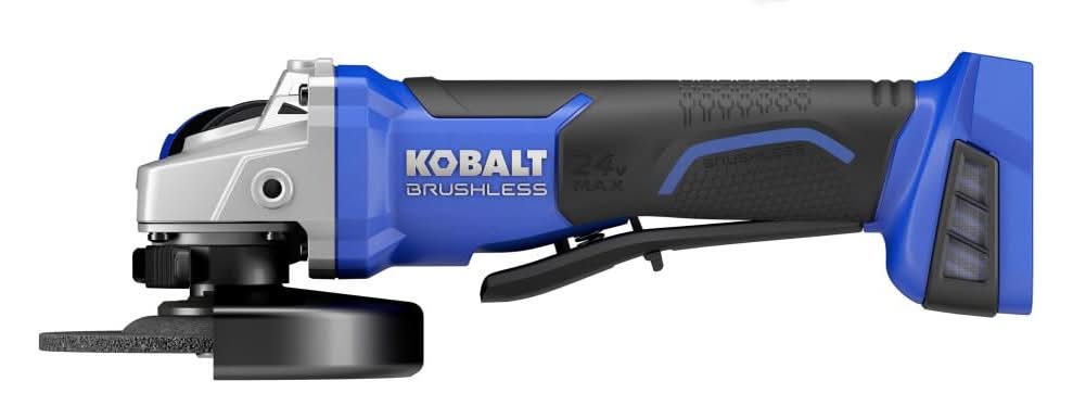 Kobalt 5-in cordless angle grinder and cutoff tool is ideal for cutting, sanding, polishing, sharpening or grinding. 24-volt max brushless motor delivers 8,500 RPM, so you can tackle even the toughest grinding and cutting applications. Tool-free guard allows you to quickly adjust from cutting to grinding. Paddle switch features a lock-off switch for easy, one-hand operation. 3-position auxiliary handle features anti-vibration technology that provides more comfortable use and reduces fatigue during extended periods. Handle offers convenient blade wrench storage, so it is always within reach. Includes 5 grinding discs, cutoff disc, grinding guard, cutting guard, blade wrench and soft bag. Compatible with all Kobalt’s 24-volt max batteries and chargers for your convenience (batteries and chargers sold separately). Kobalt’s 5-year tool warranty gives you peace of mind. Color: Blue