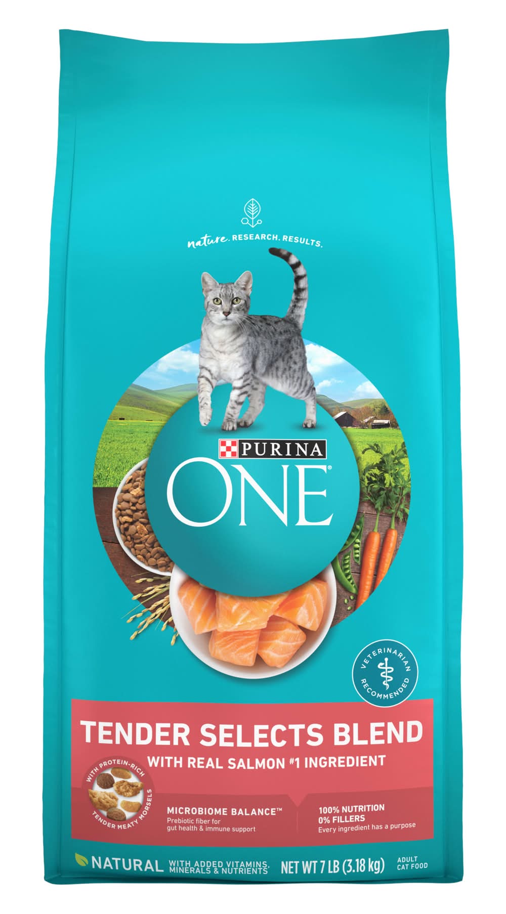 Real salmon is the first ingredient in this great-tasting adult cat food formula crafted with real ingredients, including accents of real carrots and peas. Purina ONE with salmon cat food with high protein helps support strong muscles, including a healthy heart. Natural dry cat food with vitamins, minerals and nutrients is easily digestible.