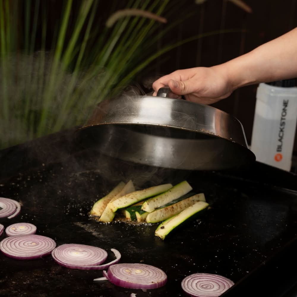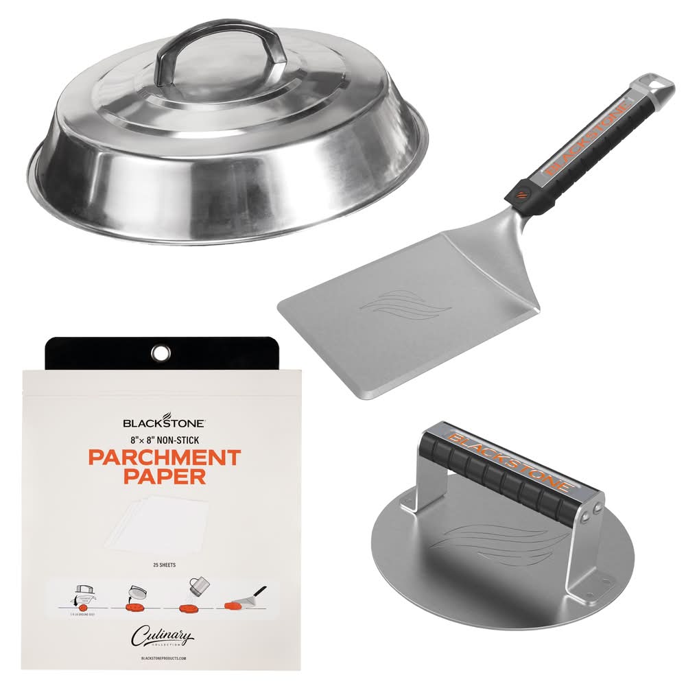 One XL hamburger spatula--stainless steel, beveled edges, and plastic handle. 6-Inch hamburger press--stainless steel and plastic handle. 12-Inch basting dome--stainless steel and plastic handle. 25 Sheets of parchment paper--coated with silicone, 8 x 8-inches. Basting dome, XL hamburger spatula, and hamburger press are dishwasher safe.
