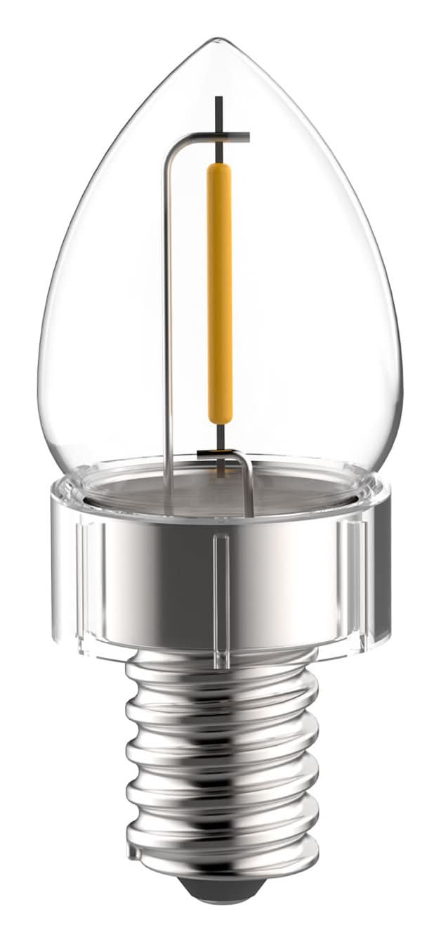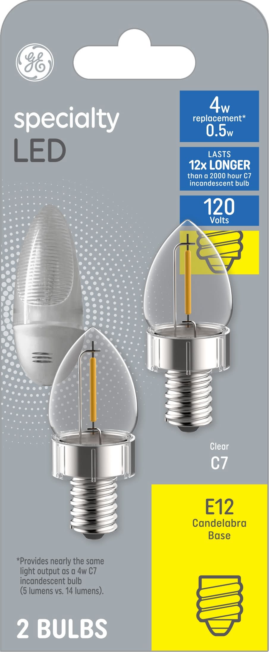 4 Watt replacement using only 0.5 Watts. Warm, soft white high definition light/2700 Kelvin color temperature. Rated to last 25,000 hours. Not suitable for dimming. Rated to last 15,000 hours. 2 LED bulbs per package. Mini candelabra base (E-11) base type. C7 shape and size. Use Location: Indoor Color: 80