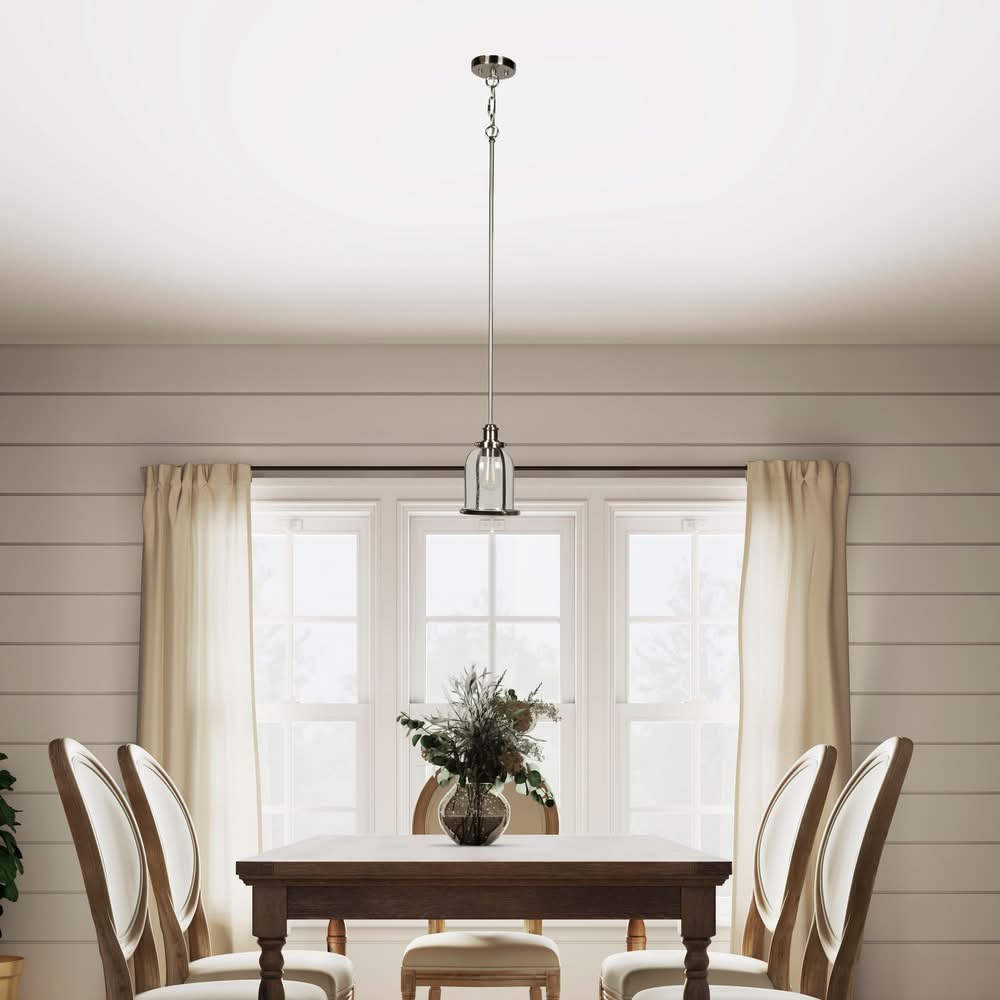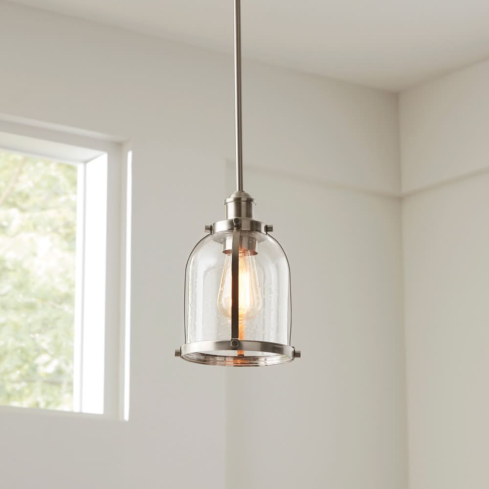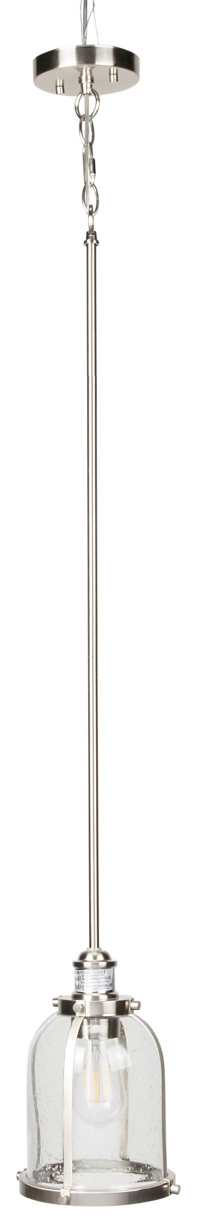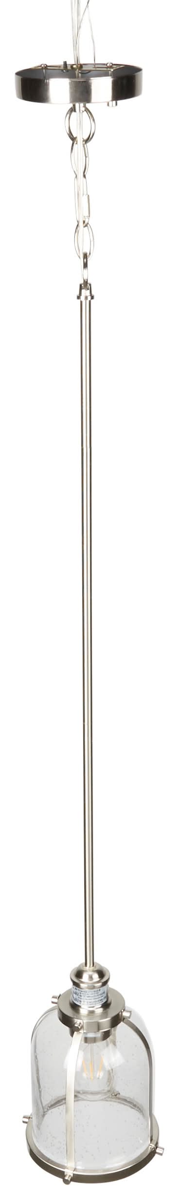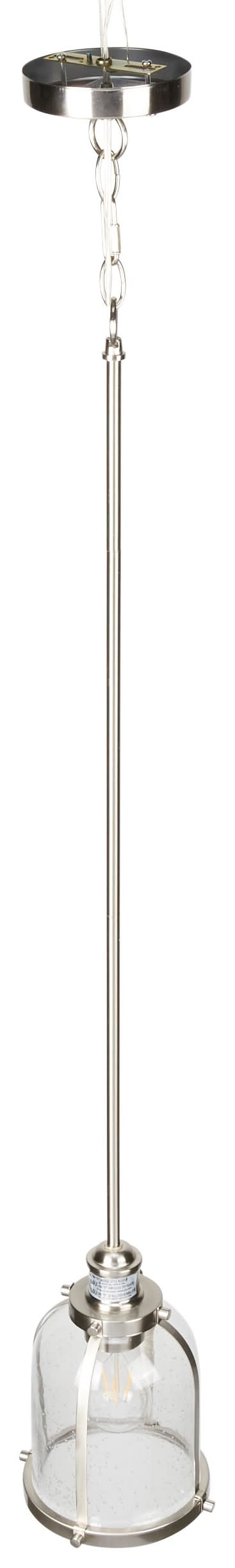 Brushed nickel finish. Seeded glass shade. (4)12-in and (2)6-in rods included. Use Location: Indoor
