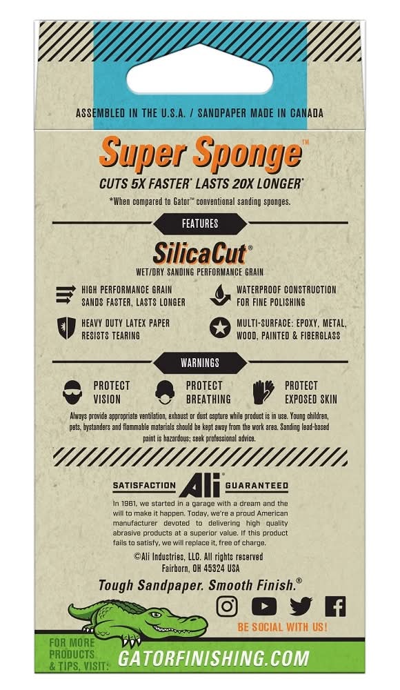 Made from Premium AlumiNext™ Sandpaper fused to a durable foam core for increased performance and comfort while sanding. Cuts 5x faster and lasts 20x longer than conventional glue-on-grit foam sponges. Sand wet or dry with high performance grain that sands faster and lasts longer. Anti-clog coating resists build up on paper during use. Heavy duty construction resists tearing, cracking and deformation. 1000 Grit, Micro Fine Grade Waterproof Sanding: Best for sanding color or clear coats before buffing to a satin finish. Use an air tool or industrial eraser to clean grain surface for extended product life. Multi-surface use: epoxy, fiberglass, metal, painted or coated surfaces, and wood. Made in the USA.
