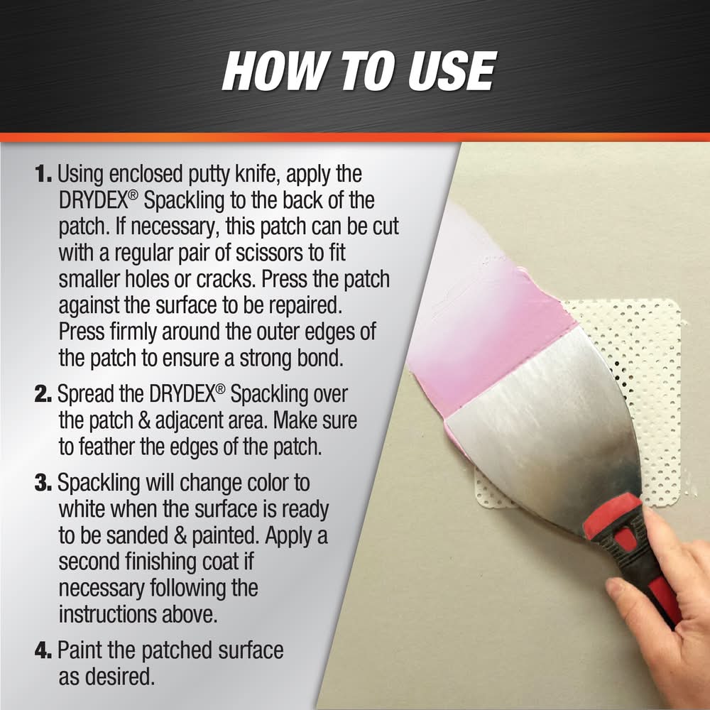 Drywall repair kit can be used for repairing interior or exterior surfaces like drywall, plaster, wood, brick and stone. Kit contains: spackle, 5x5 fiber tough patch, 4x3 100 grit sandpaper and putty knife. For exterior or moisture exposed applications, apply waterproof primer, then apply waterproof coating prior to moisture exposure. When used indoors, wall patch does not require priming. Dries within 1 hour for repairs 1/8" in depth, for repairs deeper than 1/8" apply two or more layers allowing to dry between. Can be painted after full dry through. Durable spackling will not crack, crumble, flake or shrink and creates professional looking wall repairs that last. Immediately clean up wet product with water, dry product must be scraped or sanded away. Use Location: Interior/Exterior For CA Residents Only: WARNING: This product can expose you to chemicals including Lead which are known to the State of California to cause cancer and birth defects or other reproductive harm. For more information go to www.P65Warnings.ca.gov. Color: White