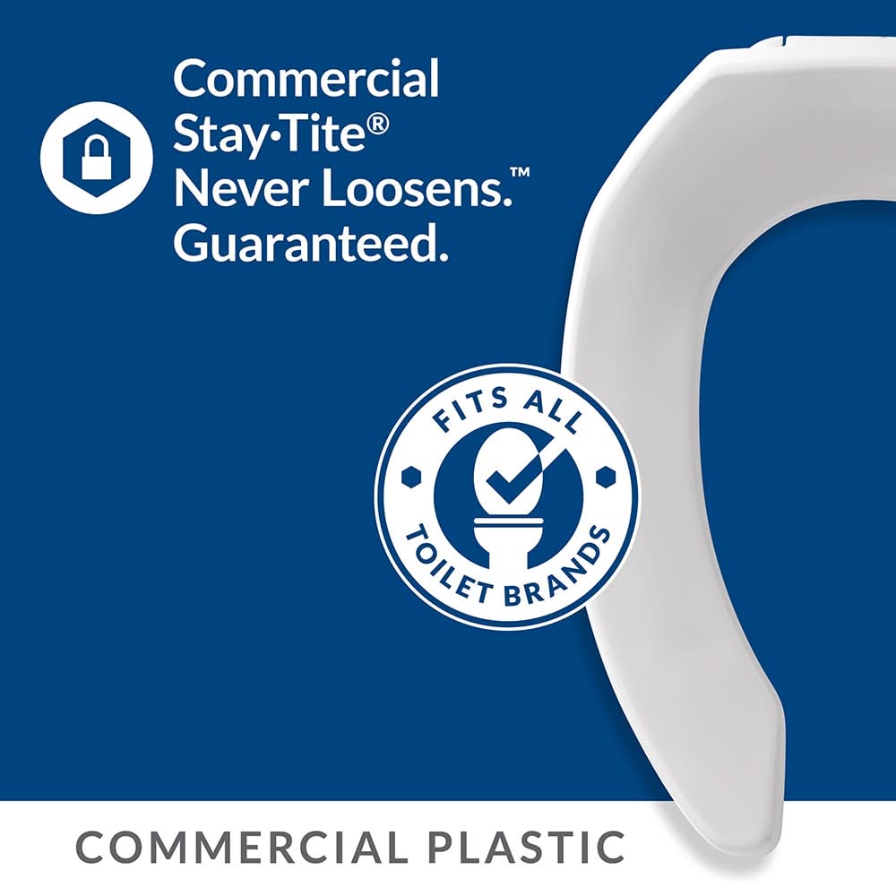 Commercial Stay·Tite Seat Fastening System reduce installation time, eliminate callbacks for loose seats. Commercial-grade, heavy-duty plastic with molded-in color resists wear, chips and stains. Check hinges prevent the seat from going 11 degrees beyond vertical. 300-series stainless steel posts and pintles resist corrosion. Fits all manufacturers’ elongated toilet bowls. Proudly made in the USA. Made with eco-friendly materials and processes. Color: White