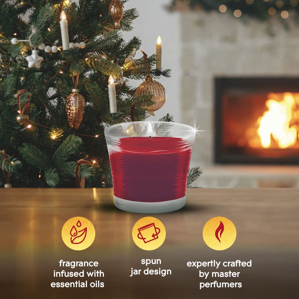 Glade® Warm Apple & Spices small jar candle infused with honeycrisp apple, cinnamon sugar, and sweet vanilla bean. Fragrance infused with essential oils. This candle’s warm glow and bold scent instantly transforms your room, making it feel special and inviting. The new spun jar design adds a touch of elegance from the bedroom to the living room and all of the spaces in between. Made without phthalates, parabens, or formaldehyde. Also try the Warm Apple & Spices scent as a Glade® air freshener spray, wax melt, automatic spray, or PlugIns® refill. Use Location: Indoor Color: Red