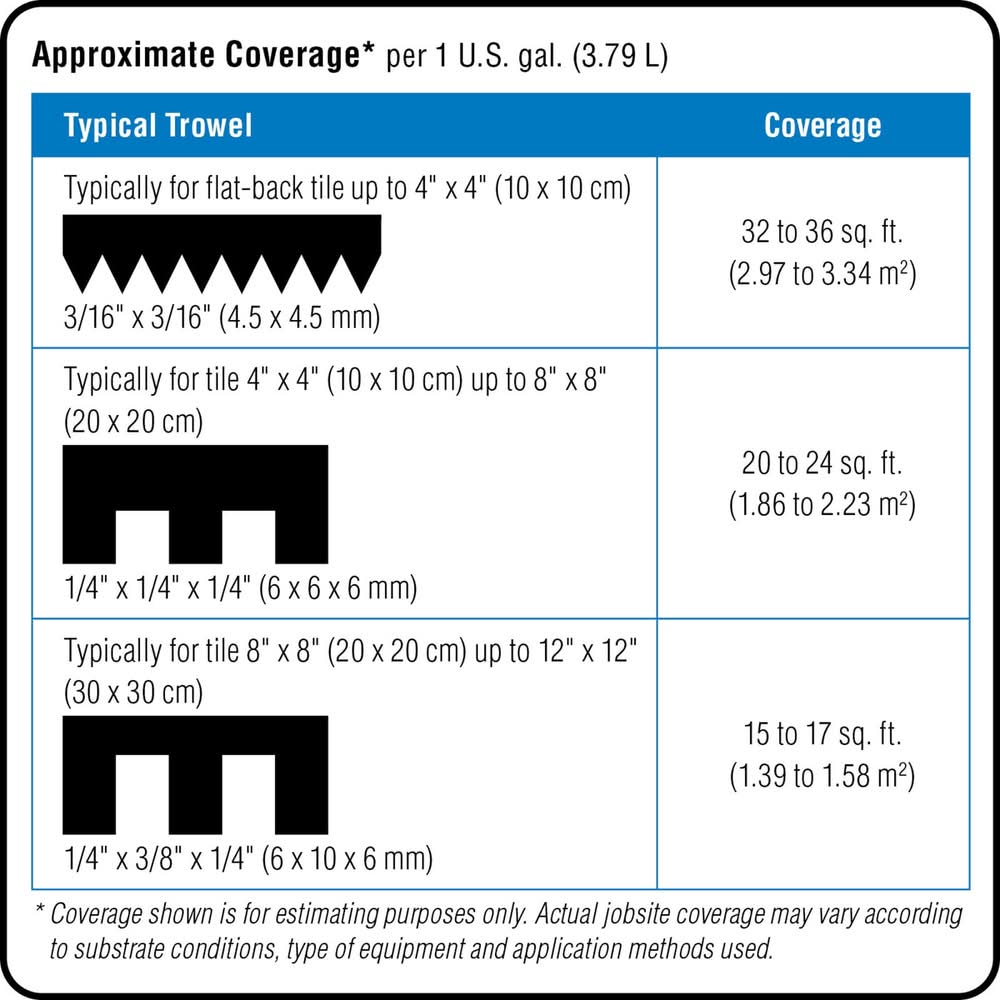 For use with ceramic, porcelain and most types of marble and natural stone tiles. Tile up to 20-in. Suitable substrates: gypsum wallboard (dry walls only), cement board, exterior-grade plywood (interior only), concrete and masonry block. Mold and mildew-resistant. Drying times will vary depending on the tile size, tile/substrate porosity and humidity. For interior use only. Smooth and easy to spread premixed adhesive. May contribute to LEED certification project points. Use Location: Indoor For CA Residents Only: WARNING: This product can expose you to chemicals including Lead which are known to the State of California to cause cancer and birth defects or other reproductive harm. For more information go to www.P65Warnings.ca.gov.