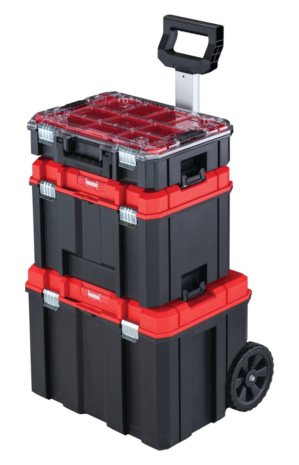 Completel mobile tool box: Rolling tool chest tower includes 1 extra large mobile bottom unit, 1 deep storage unit for large tools, and 1 top unit with organization compartments and a heavy duty clear lid for full visibility. Portable: All units stack on top of each other and connect with side latches for easy transport, 7-in wheels make it easier to move the rolling cart tower when it’s full. Durable: Each CRAFTSMAN® tool box unit is made of IP54 rated water and dust resistant material to withstand heavy use on job sites and home improvement projects. Secure: Metal side latches, individual tool box closures, and the top tool organizer lid all securely latch in place for a secure garage storage solution. Flexible storage: The VERSASTACK™ tool storage system is a flexible system that allows for many different storage combinations based on user needs. The CRAFTSMAN® VERASTACK™ Rolling Tool Box Tower features handy tool organizers and storage for a wide range of tool sizes, within Color: Black