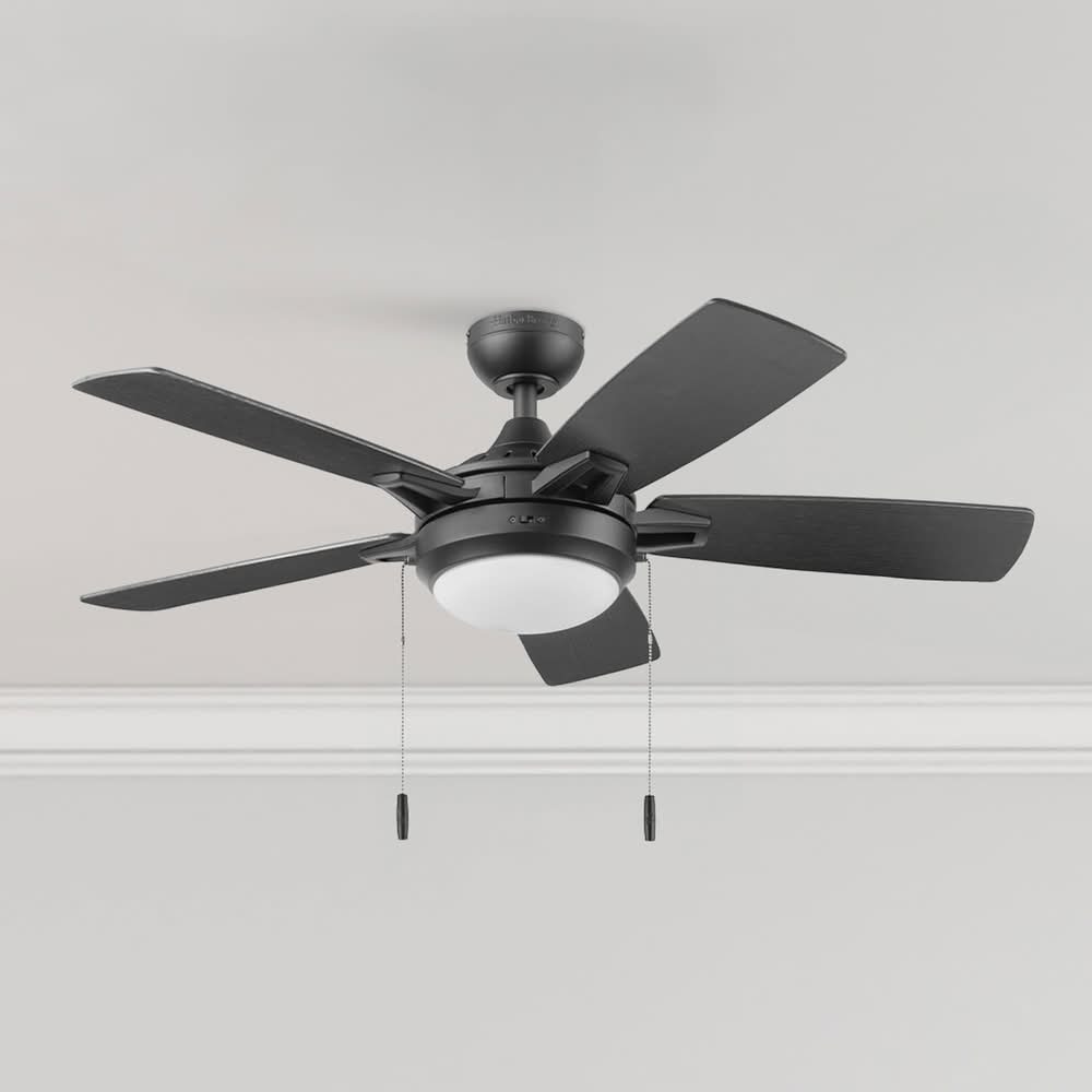 Adjustable white color changing technology features light color ranging from a warm white light to a bright white light. Two-position ceiling fan can be hung from standard or angled ceilings using the 4 in downrod that is included. Easy-to-use pull chains are included for quick adjustments to the speed settings and light output; also compatible with universal ceiling fan remote control (sold separately). Frosted glass light kit houses integrated LED board that is dimmable, 1400 lumens and 16 watts. At installation, choose your color temperature preference with the flip of the switch located on the LED board (2700K, 3000K, 4000K, 5000K or 6500K). 44 in ceiling fan provides airflow ideal for small to medium sized rooms, including bedrooms and office spaces. Quiet, reversible 3 speed motor efficiently circulates cool air in the summer and warm air in the winter, cutting down on energy costs. Limited lifetime warranty. Use Location: Indoor For CA Residents Only: WARNING: This product can expose you to chemicals including Lead which are known to the State of California to cause cancer and birth defects or other reproductive harm. For more information go to www.P65Warnings.ca.gov. Color: Yes