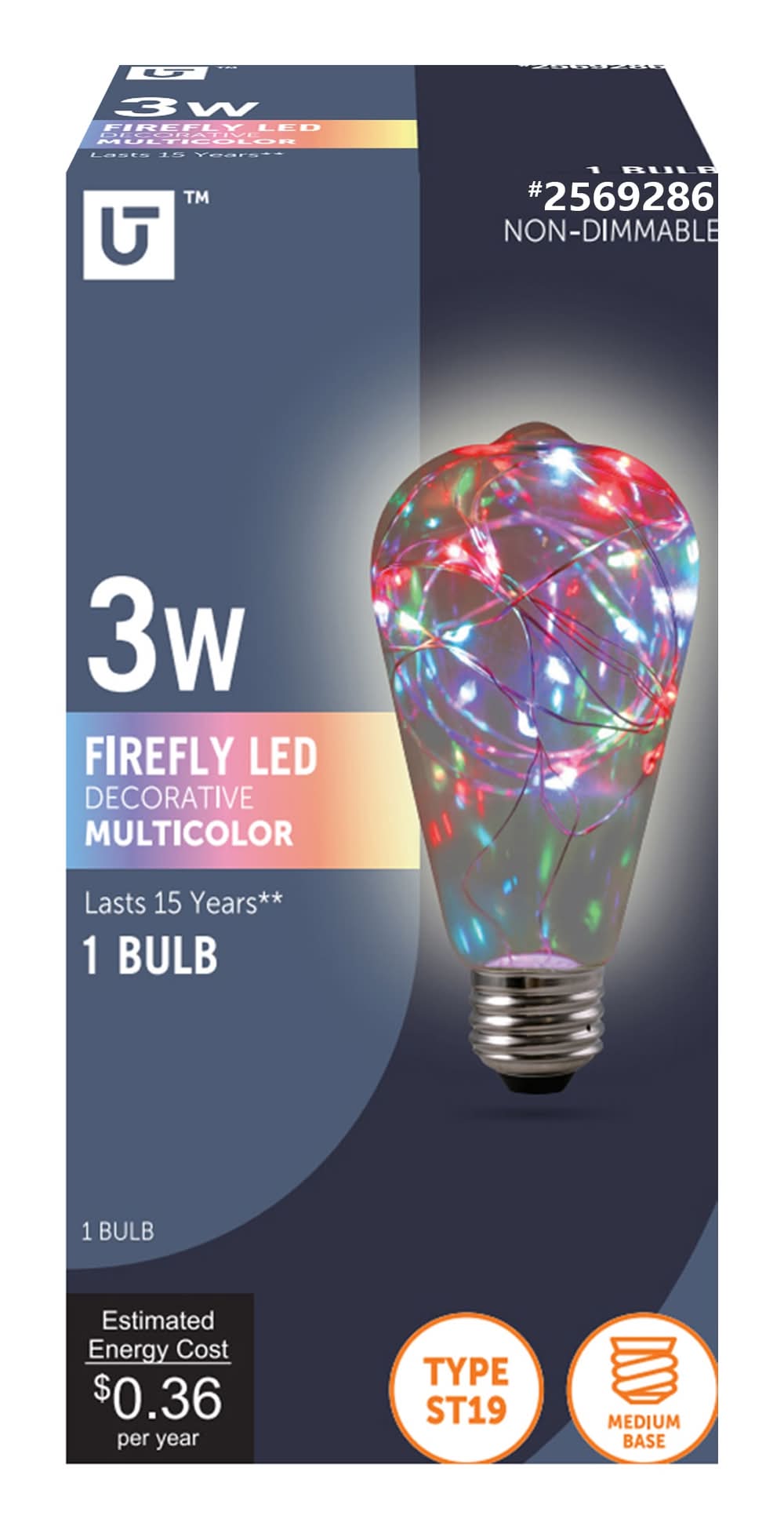 ST19 LED Fairy Bulb. 1 pack. 40 Watt bulb. Medium base (E26). 2-year warranty. Rated operational lifetime of 15,000 hours. UL rated suitable for damp location installation. Energy efficient bulb operates at only 3 watts. Not suitable for use with dimmers. Use Location: Indoor Color: 80