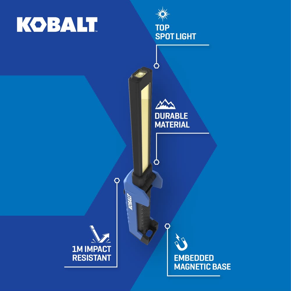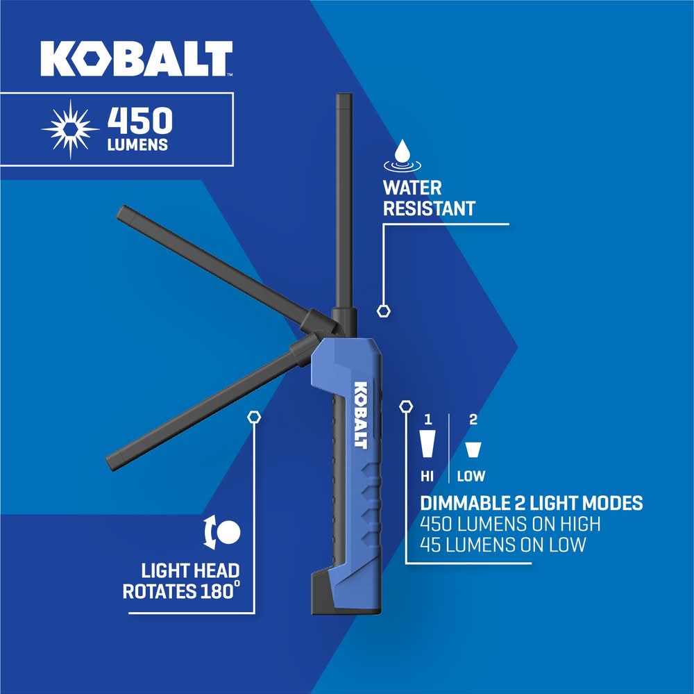 KOBALT 450LM SLIM INSPECTION LIGHT 5759956. PIVOTING HOOK. DIMMABLE. Use Location: Indoor/Outdoor For CA Residents Only: WARNING: This product can expose you to chemicals including Lead which are known to the State of California to cause cancer and birth defects or other reproductive harm. For more information go to www.P65Warnings.ca.gov. Color: Multiple colors/finishes
