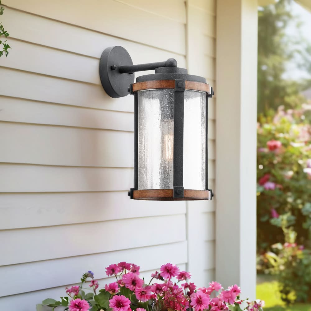 Distressed black and wood tone finish in a traditional craftsman design will complement your homes overall look. With clear seeded glass, it's sure to enhance the nostalgic touch you're looking for. Great for craftsman or rustic style decor. Fixture dimensions: 6.5-in width x 13-in height x 7.75-in depth. Requires one 60 watt medium base bulb (not included). Backplate measures 4.5-in x 4.5-in. Mounting hardware included to simplify installation. Mounting hardware, wire nuts, and detailed instructions are included for an easy installation. Limited warranty, see manufacturer for details. For CA Residents Only: WARNING: This product can expose you to chemicals including Lead which are known to the State of California to cause cancer and birth defects or other reproductive harm. For more information go to www.P65Warnings.ca.gov. Color: No