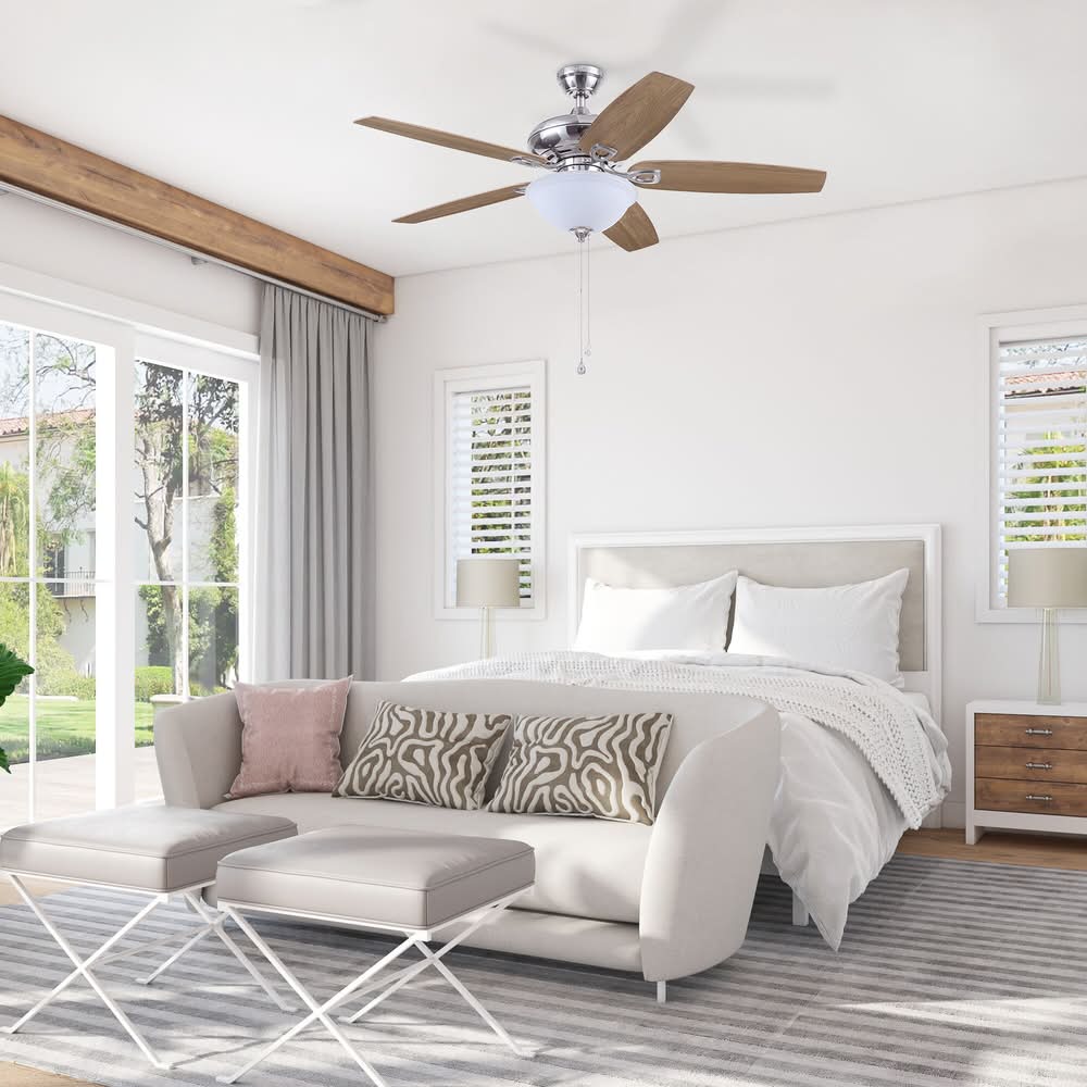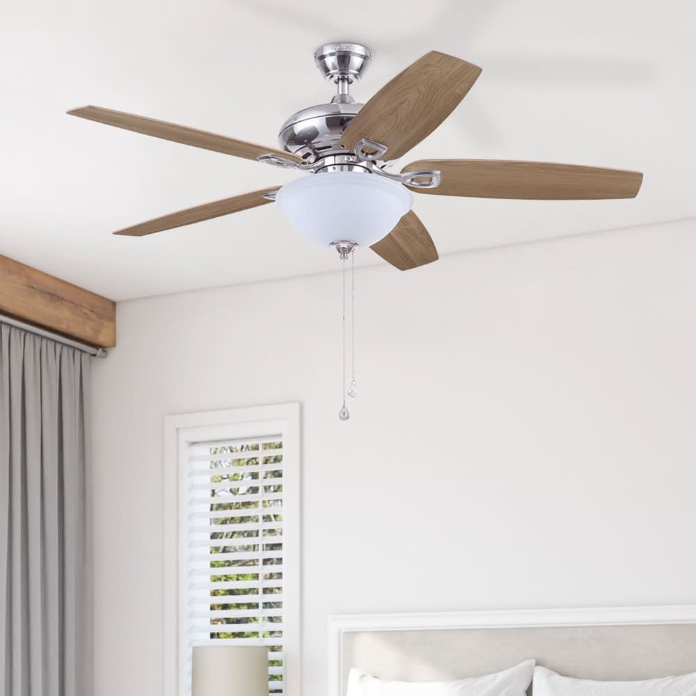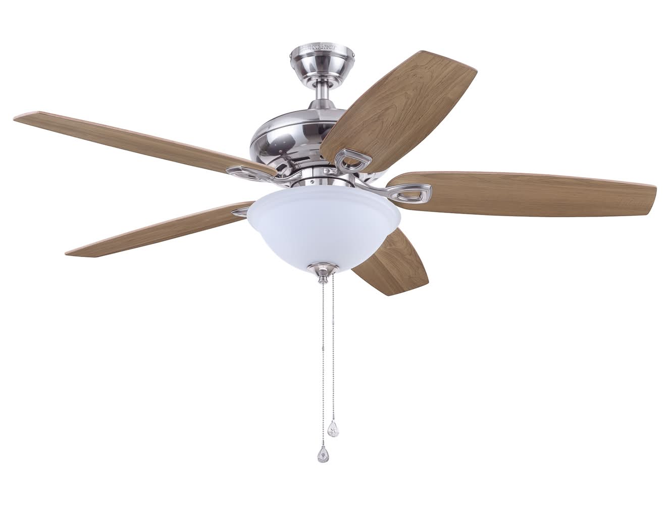 Tilt and Clean feature allows you to easily and quickly clean the glass and replace the light bulbs. Light kit with frosted glass bowl houses 2 A15/E26 LED bulbs that are included (can be installed with or without light kit). Can be hung flush with the ceiling where more walk-through space is, on standard ceilings with a 4-in downrod (included) or on angled ceilings. 52-in fan with airflow up to 3448 CFM is ideal for large rooms. Two easy to use pull chains are included for quick adjustments to the 3 speed settings and light output. Quiet, reversible motor efficiently circulates cool air in the summer and warm air in the winter, cutting down on energy costs. Great for traditional or transitional style decor. Limited lifetime warranty. Use Location: Indoor For CA Residents Only: WARNING: This product can expose you to chemicals including Lead which are known to the State of California to cause cancer and birth defects or other reproductive harm. For more information go to www.P65Warnings.ca.gov. Color: No