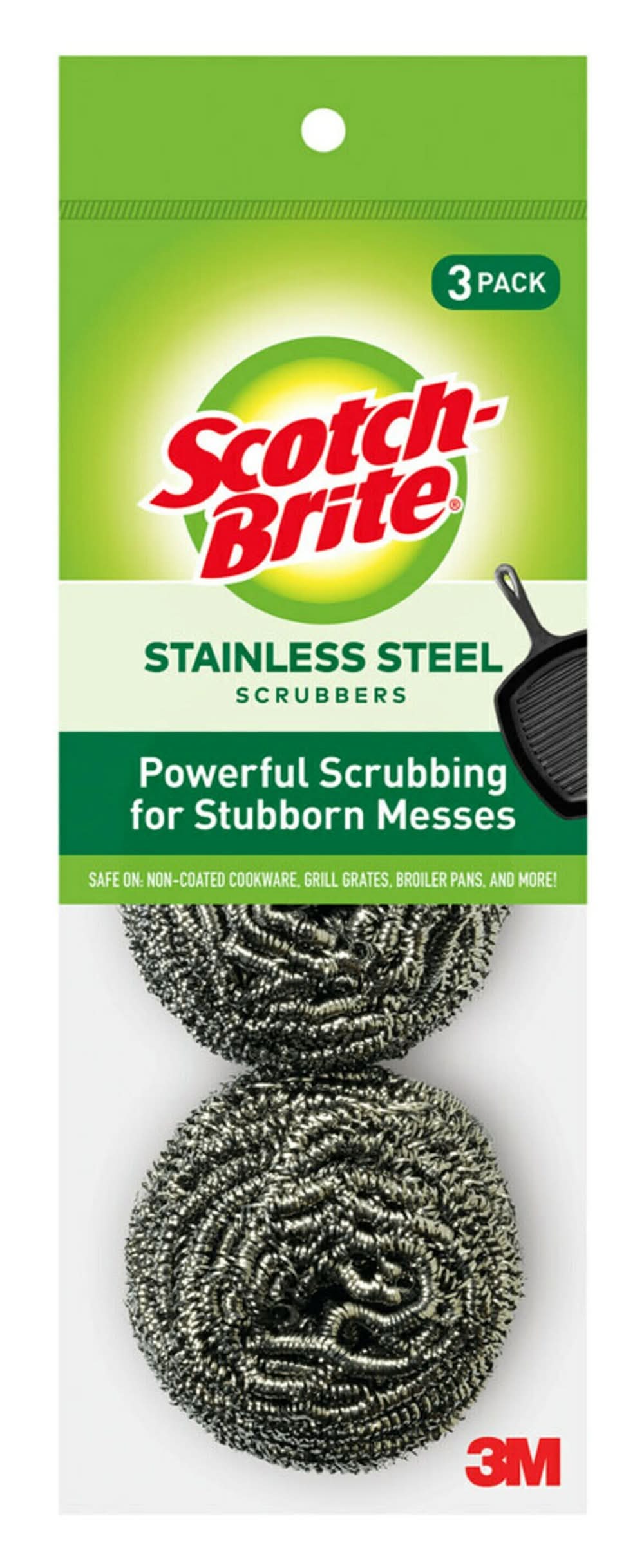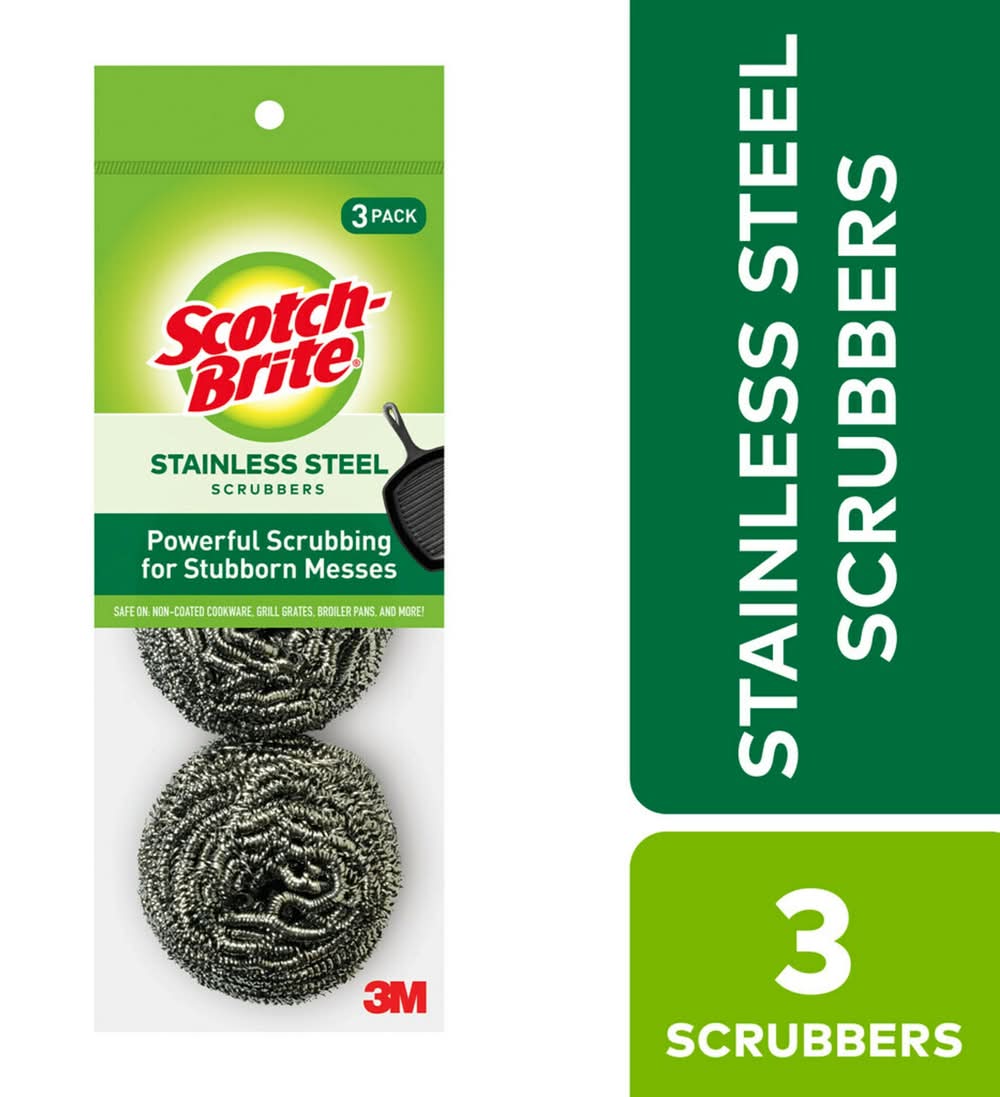 THREE DISH SCRUBBERS: This pack of Scotch-Brite® Stainless Steel Scrubbers includes 3 scrubbers. POWERFUL CLEANING: These stainless steel kitchen scrub pads for dishes cut through and remove tough soil and burnt-on food fast. CLEANS TOUGH MESSES: Each scouring pad cleans grease, grime, and dirt so even the messiest surfaces will shine like new. MADE FOR HEAVY DUTY JOBS: These scrub pads are best to use for tough stains on non-coated cookware, grill grates, oven racks, broilers, and other stubborn messes. BUILT TO LAST: These scour pads are long-lasting and durable to conquer tough job after tough job. AMERICA’S #1 SCOUR BRAND: Committed to quality and satisfaction, known for innovation in cleaning tools and trusted for 65 years* (*2023 IPSOS Brand Health). Color: Gray