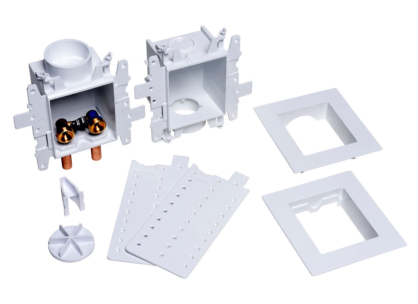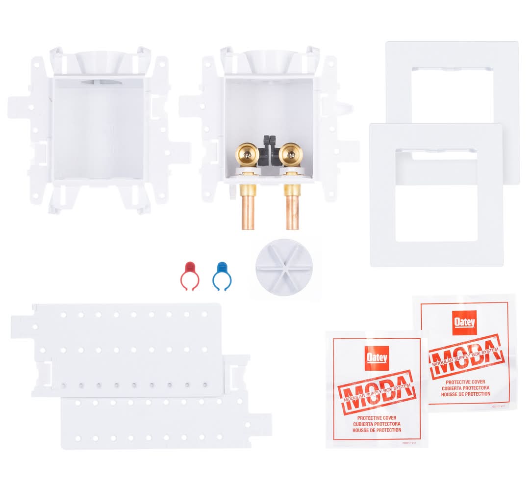 MODA® compact-size washing machine outlet box. Infinite configuration options for easy, flexible installation. Connects to copper supply line with sweat connection. 2-in drain opening fits PVC or ABS Sch 40 DWV pipe. Includes (2) valves with 1/2-in copper tailpiece and a two-piece valve design for easy repair or replacement without damaging drywall. Advanced snap-lock design allows for easy assembly/disassembly and connection to another MODA box. Separate valve and drain boxes allow paired or split boxes between walls or stud bays to prevent supply/drain crossovers; valves rated to 150 PSI air and 250 PSI water. Dual box design provides ideal options for stacked washer/dryers and space-limited laundry rooms. Includes an emergency drain port and tool-free quarter-turn test plug with gasket to prevent knock outs falling down the drain pipe. For CA Residents Only: WARNING: This product can expose you to chemicals including Lead which are known to the State of California to cause cancer and birth defects or other reproductive harm. For more information go to www.P65Warnings.ca.gov.