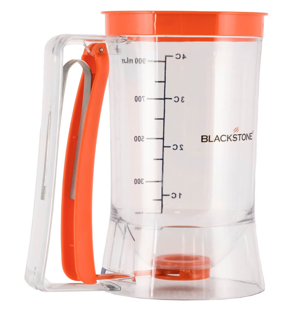 Breakfast kit for crepes, pancakes, eggs, bacon, and more. 1 Omelet ring (8-inch diameter, stainless steel, rubber handle). 1 Pancake batter dispenser (4 cup or 1 quart capacity). 1 Crepe spreader (beech wood). 4 Egg rings (4-inch diameter, stainless steel, rubber handle). 1 Pre-seasoned cast iron griddle and bacon press (heat resistant plastic handle). For CA Residents Only: WARNING: This product can expose you to chemicals including Lead which are known to the State of California to cause cancer and birth defects or other reproductive harm. For more information go to www.P65Warnings.ca.gov.