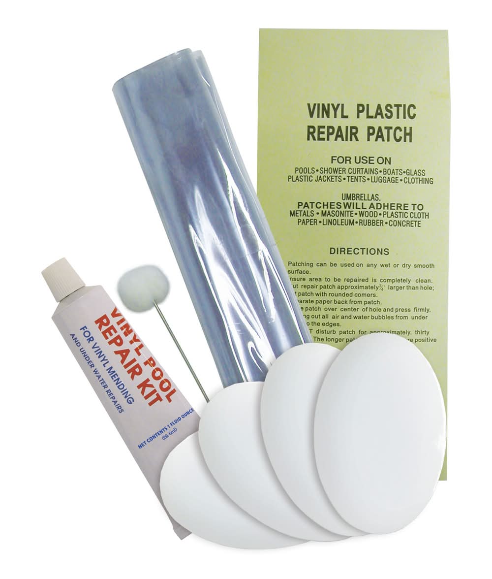 Repairs holes and rips to pool liners, inflatables and more. Works under water. Includes adhesive, applicator, clear vinyl patch, four easy stick small patches, and one large easy stick patch. Step-by-step instructions included. Easy to use. Color: Clear