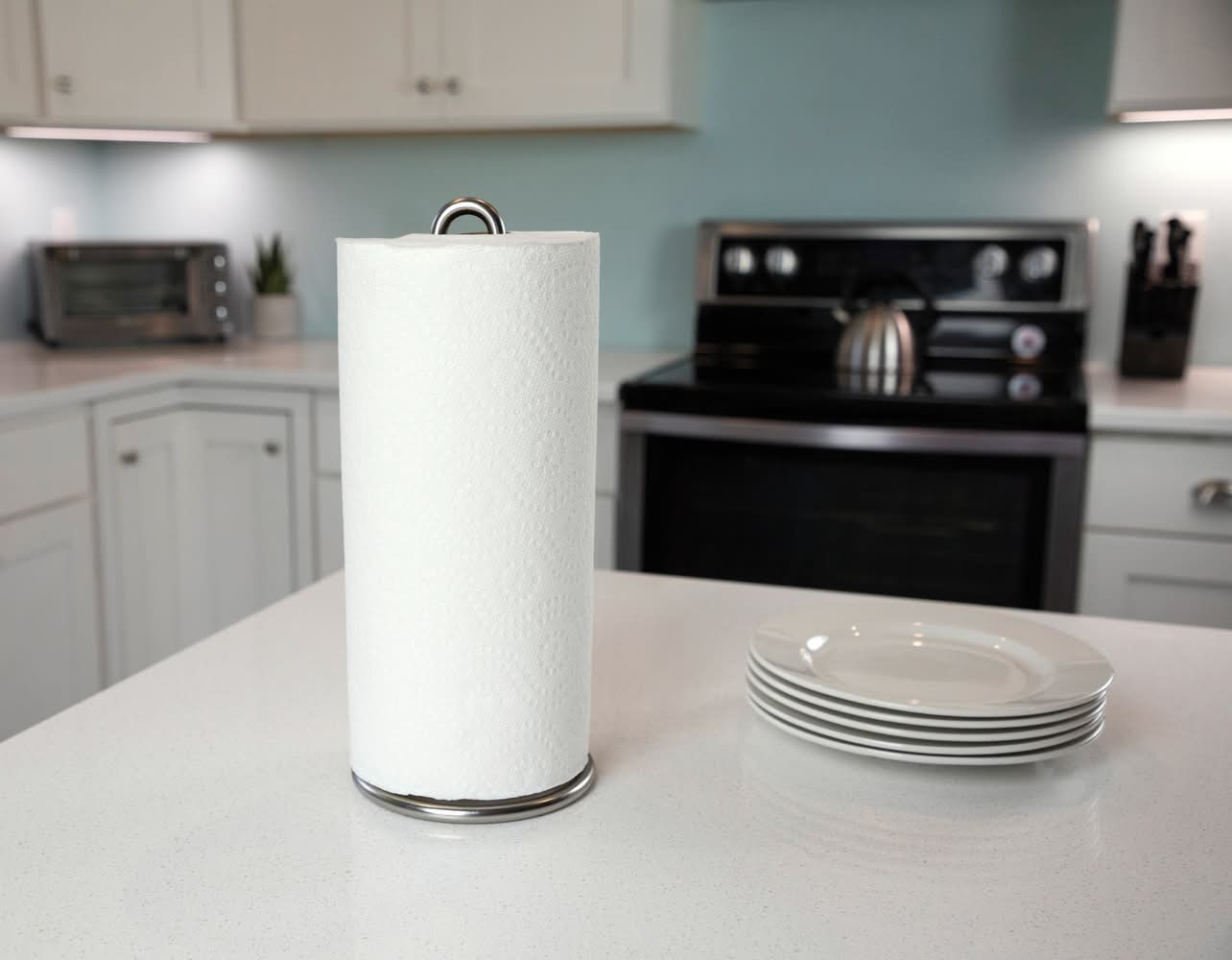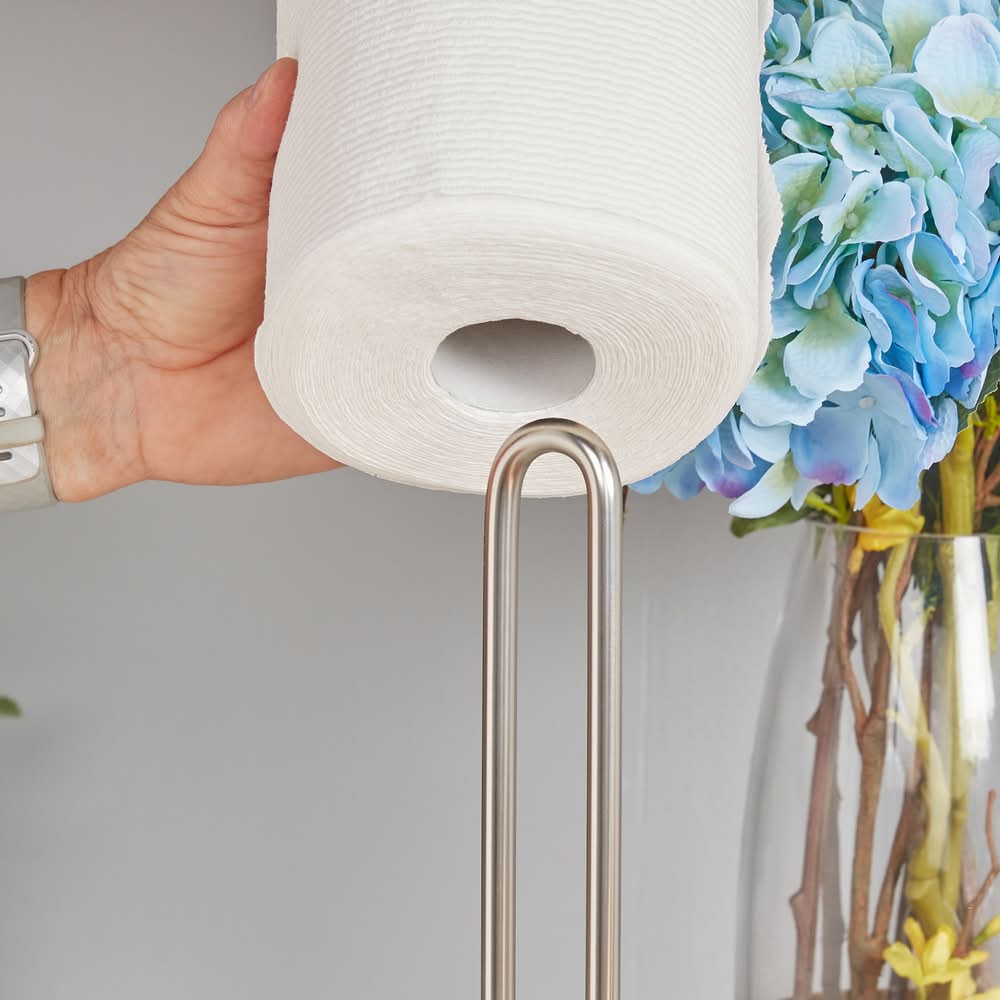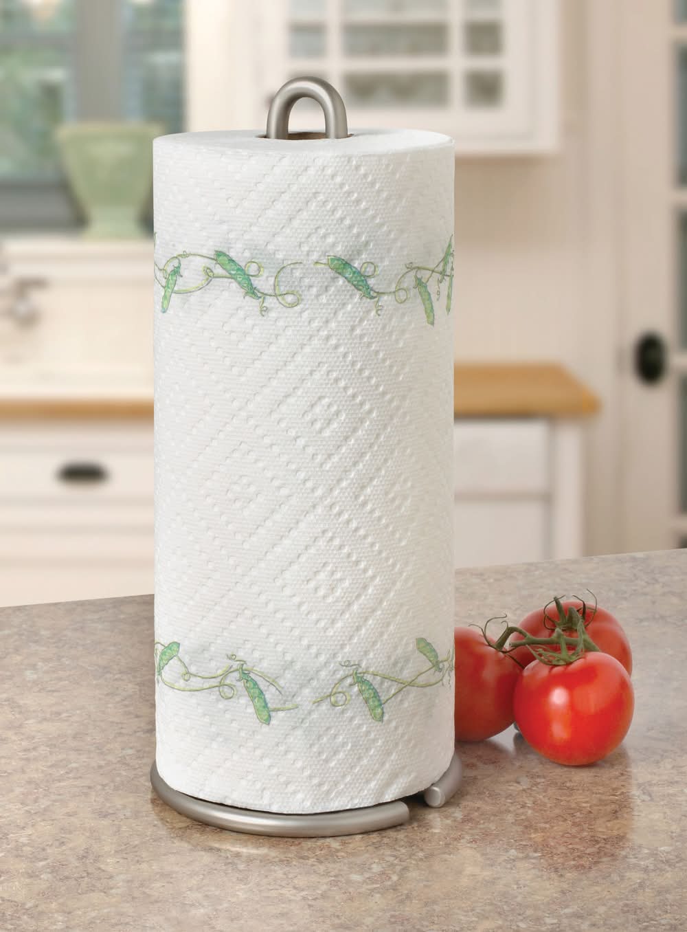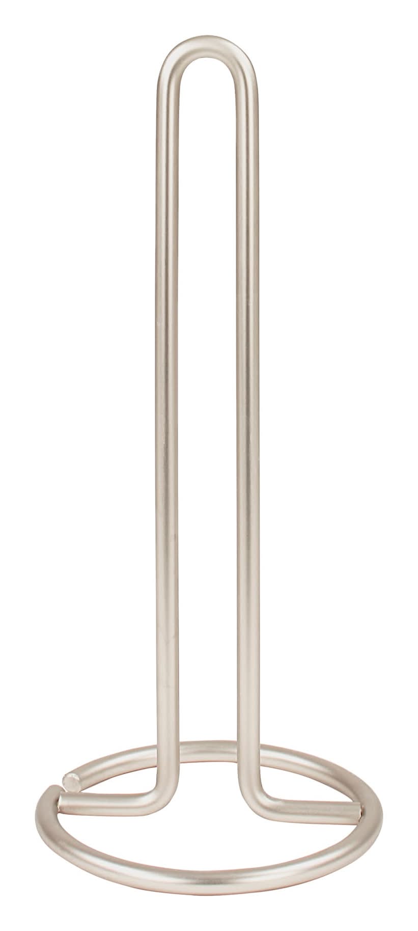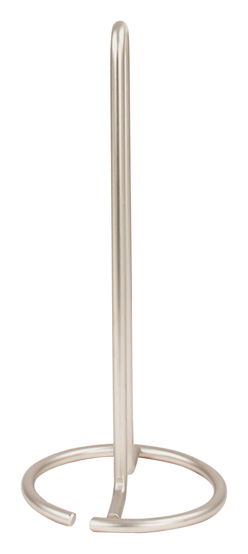 Provides a great way to store and display paper towels. The wide sturdy base keeps unit from tipping while in use. Unique elevated design keeps paper towels off the counter. Holds standard or jumbo rolls of paper towels. Features a metal loop handle for easy carrying. Clean design will add a modern touch to your home. Travels conveniently to provide paper towels anywhere as needed. Designed to coordinate with any decor. Sturdy steel construction. Color: Silver