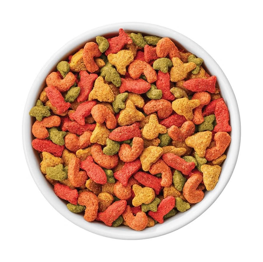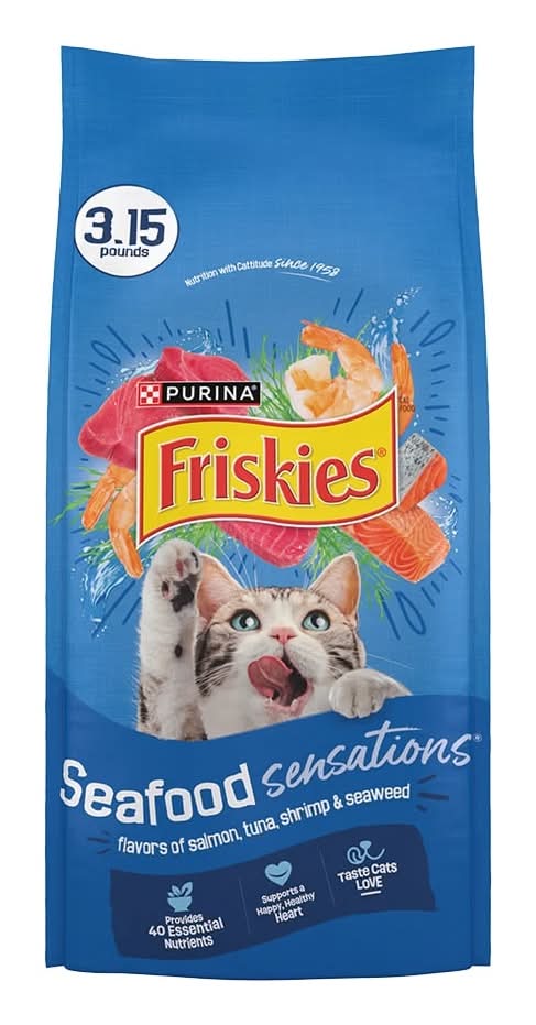 Purina Friskies Dry Cat Food Seafood Sensations With Salmon, Tuna, and Shrimp Flavors has it all, providing 100 percent complete and balanced nutrition for all life stages. Purrfect texture and flavor, with essential fatty acids for skin and coat health, vitamin A and taurine for vision support, and antioxidants for cats’ immune support. This cat-tastic cat kibble contains protein to help support healthy muscles, giving your cats everything they need for climbing, jumping, and exploring.