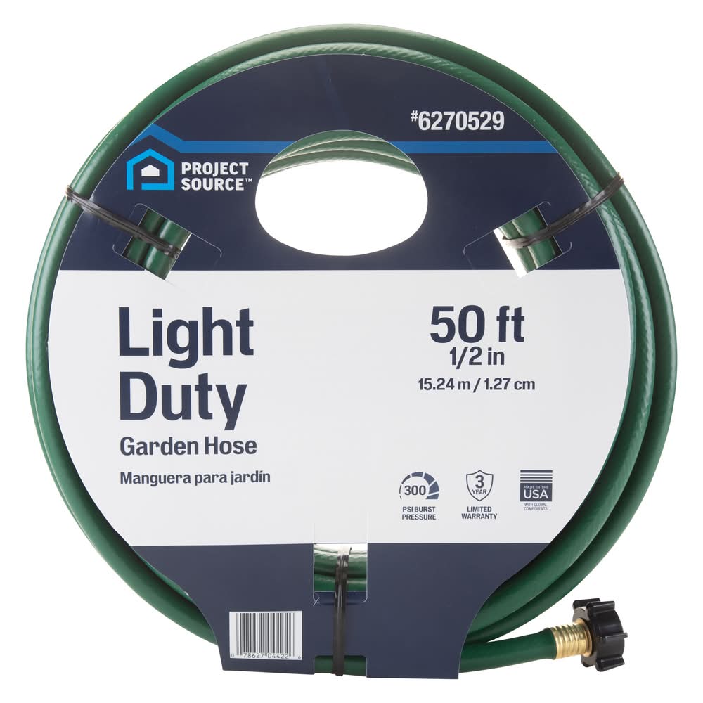 300 PSI Burst Strength Light Duty Garden Hose. Abrasion-resistant jacket is easy to clean and helps prevent wear and tear Compatible with standard faucets, hose reels, sprinklers and soaker-hose systems. Designed for the typical backyard enthusiast, Lowe's Project Source water hose is a lightweight garden hose for low-water-pressure needs - Its light weight coupled with low PSI make it the best garden hose for accomplishing light-duty gardening tasks with the least amount of effort, such as watering delicate plants and rinsing off garden tools - This low-water-pressure garden hose is also a great water-saving hose, making the Project Source both economical and environmentally friendly - It features a half-inch inside diameter, which delivers fewer gallons per minute of water, as well as a 3 For CA Residents Only: WARNING: This product can expose you to chemicals including Lead which are known to the State of California to cause cancer and birth defects or other reproductive harm. For more information go to www.P65Warnings.ca.gov. Color: Green