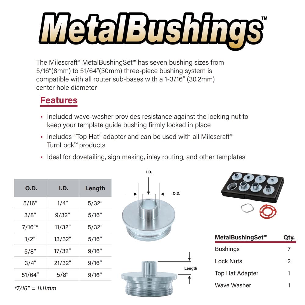 Universal 2 piece bushing system is compatible with all router sub-bases with a 1-3/16-in (30.2mm) center hole diameter. 1-3/16-in OD wave washer included, which provides resistance against the locking nut to keep your template guide bushing firmly locked in place.. Includes top hat adaptor and can be used with all Milescraft TurnLock™ products. Convert metal router guide bushings into TurnLock™ compatible bushings with ease. Offers a number of bushings to support a wide variety of routing applications. For CA Residents Only: WARNING: This product can expose you to chemicals including Lead which are known to the State of California to cause cancer and birth defects or other reproductive harm. For more information go to www.P65Warnings.ca.gov.