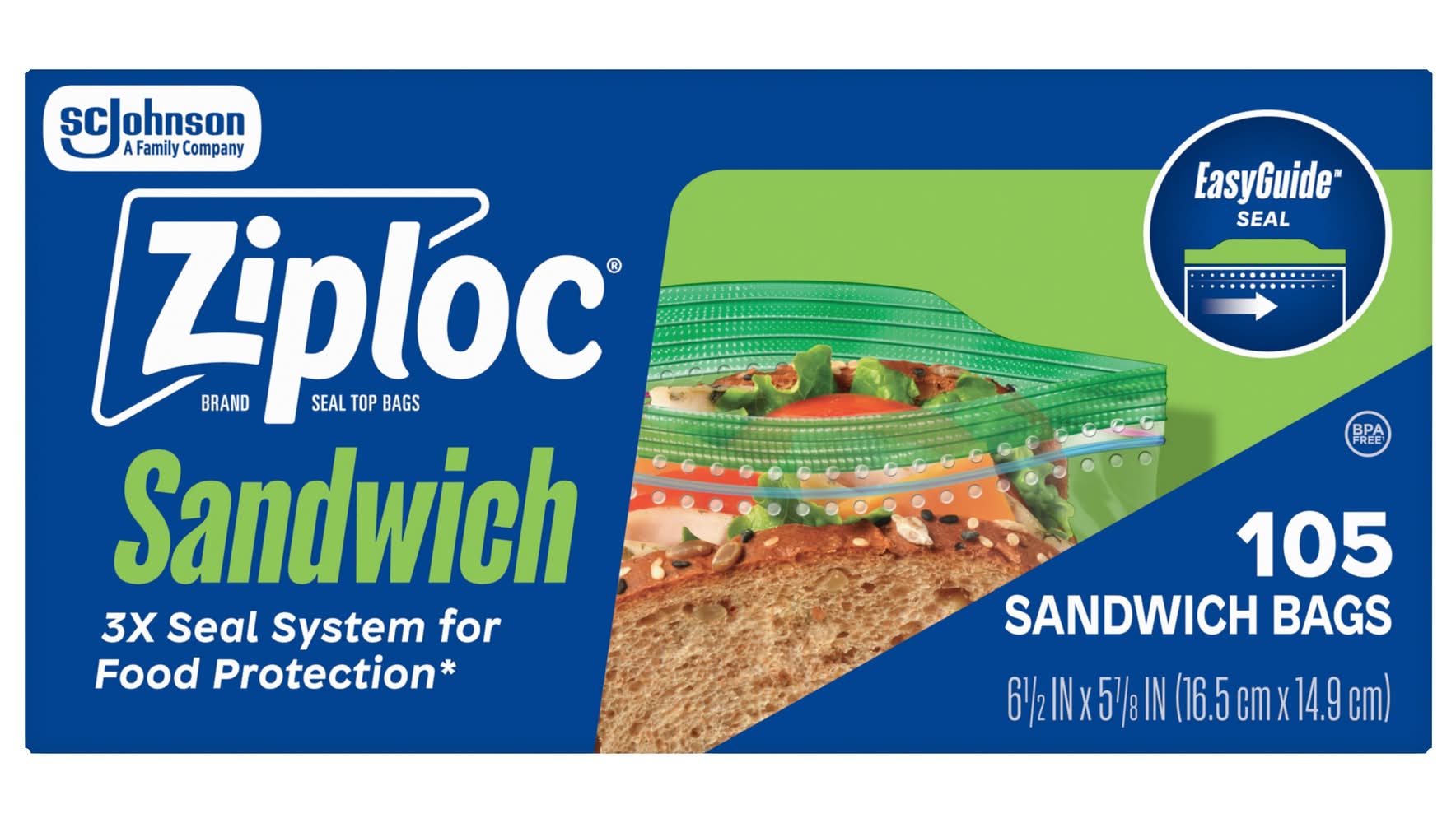 EasyGuide™ Texture: Helps you know your sandwich bag is completely sealed without missing a spot. EasyGuide™ Seal: Helps keep food fresh until lunchtime; open and close your Ziploc® sandwich bags with ease. EASYGUIDE™ SEAL: The EasyGuide™ seal helps keep food fresh on the go; open and close your sandwich bags with ease and zip confidently. Help Reduce Food Waste: Helps preserve the life of food. All Ziploc® Brand Bags are made without BPA or Phthalates. Also try Ziploc® bags in freezer, storage and compostable types. Color: Clear