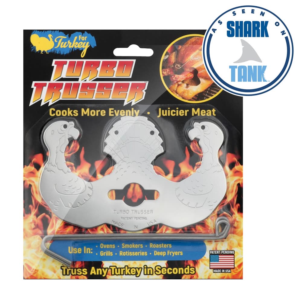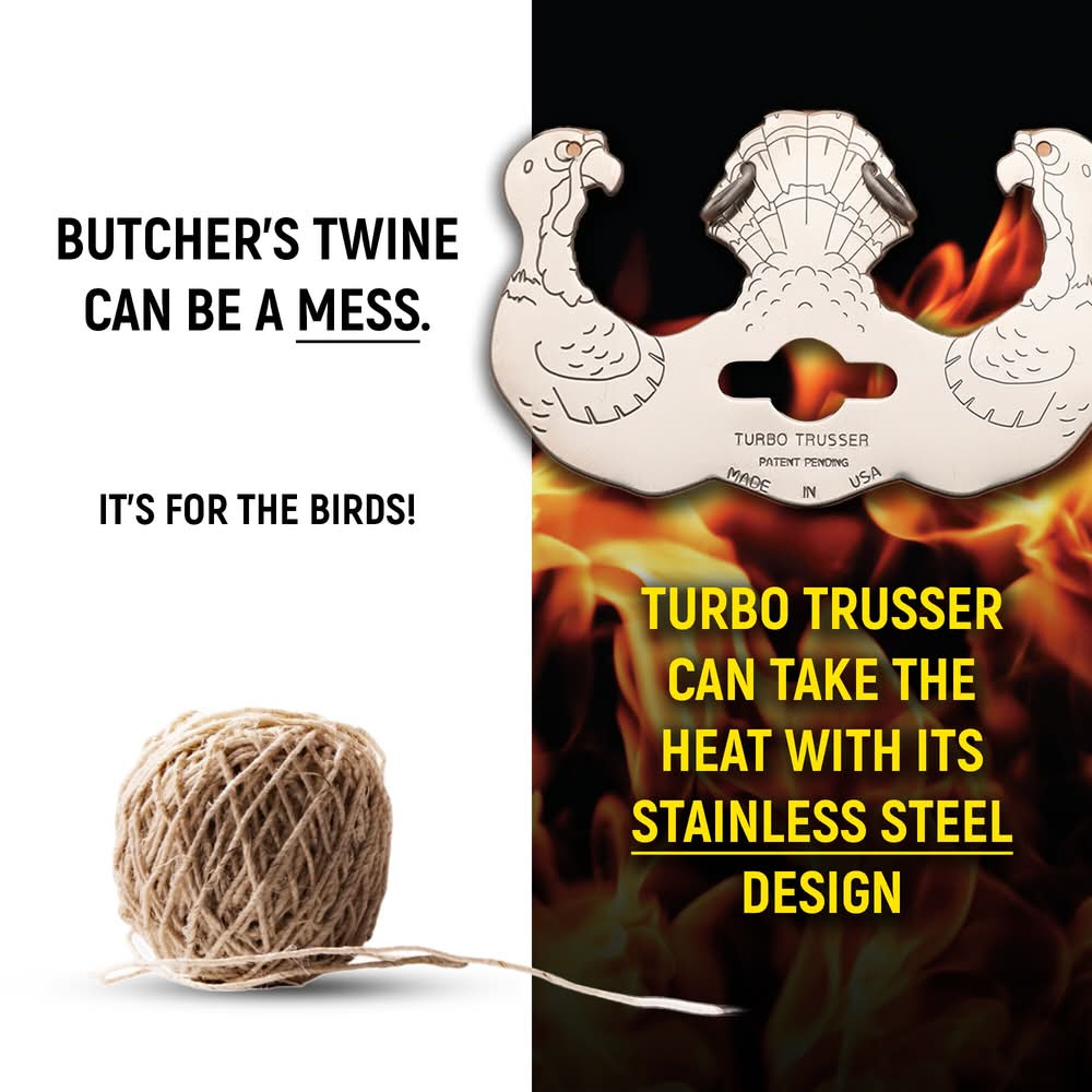 TRUSS TURKEY IN SECONDS Eliminate difficult butchers’ twine - simply use this food grade stainless steel and dishwasher safe poultry trusser while cooking.. FOR USE IN Ovens, grills, smokers, roasters, rotisseries, and deep fryers. RECOMMENDED FOR 10–25-pound Turkey or Goose. Dishwasher Safe.