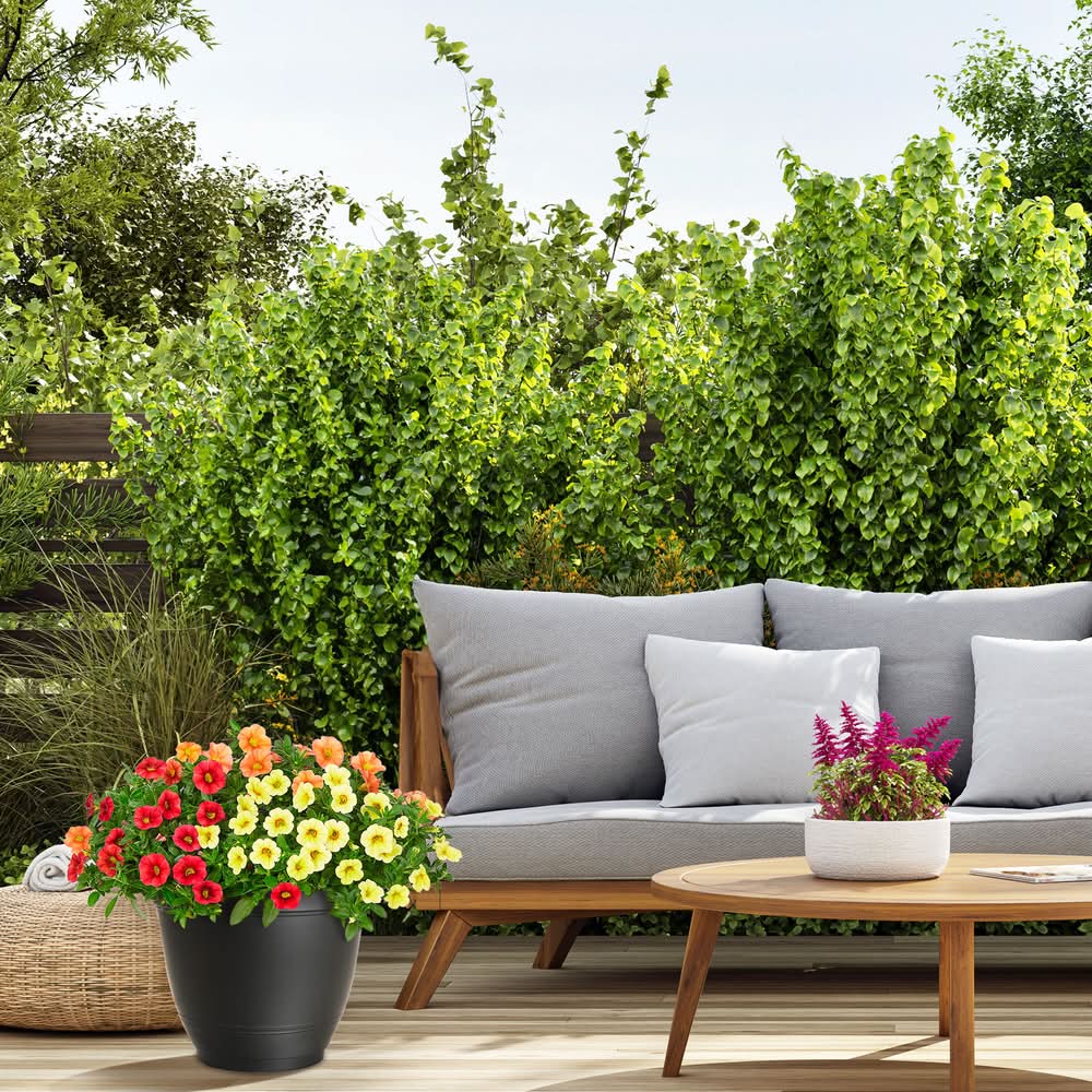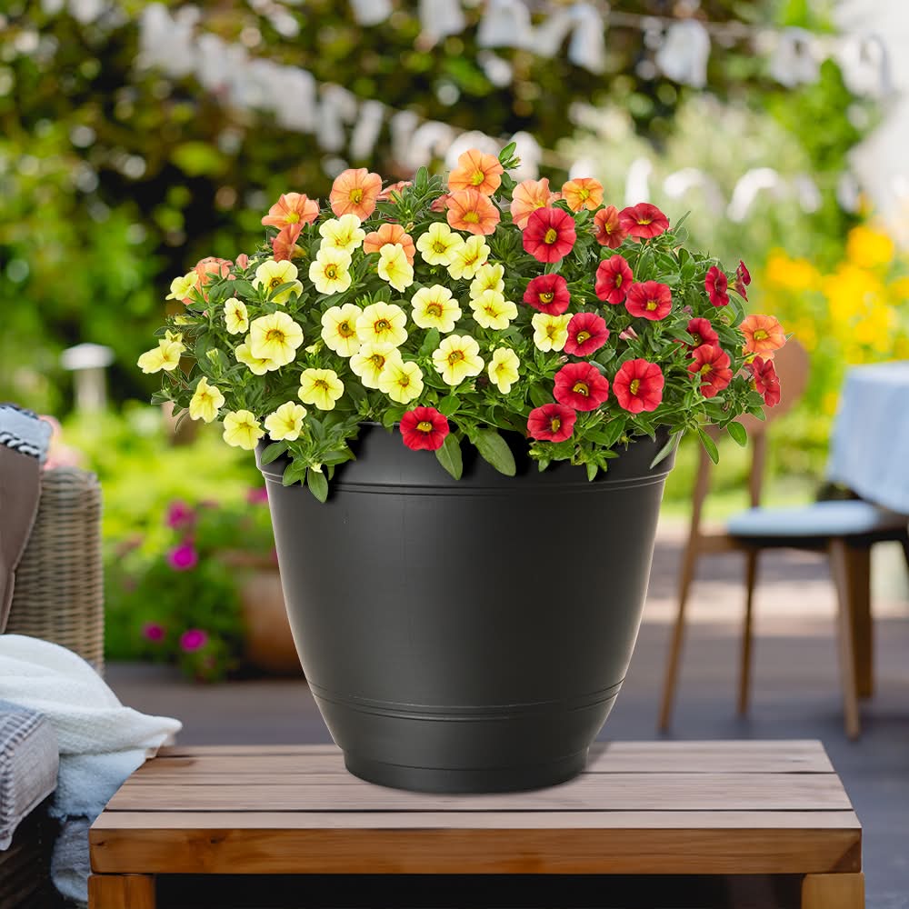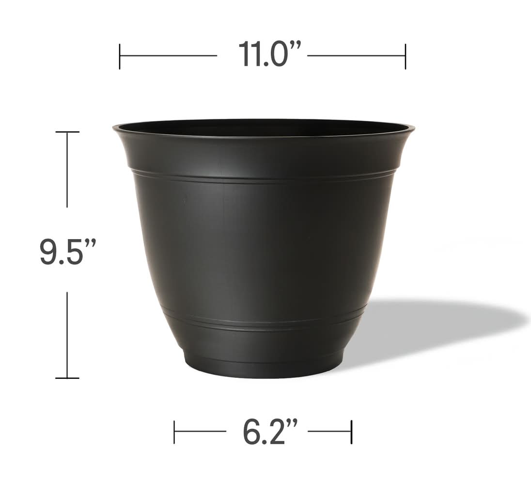 Ultra-lightweight, easy to move and handle at only 0.55 lbs empty. Dimensions: 11" wide x 9.5" tall x 6.2" base. Made from 100% recycled plastic for eco-friendly durability. Sleek matte black finish for a modern, minimalist look. All-weather resistant for any season. Easy knock-out drainage hole. Zero maintenance required. Versatile indoor/outdoor use. Designed in North America. Use Location: Indoor/Outdoor Color: Black