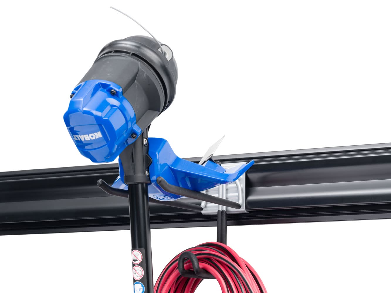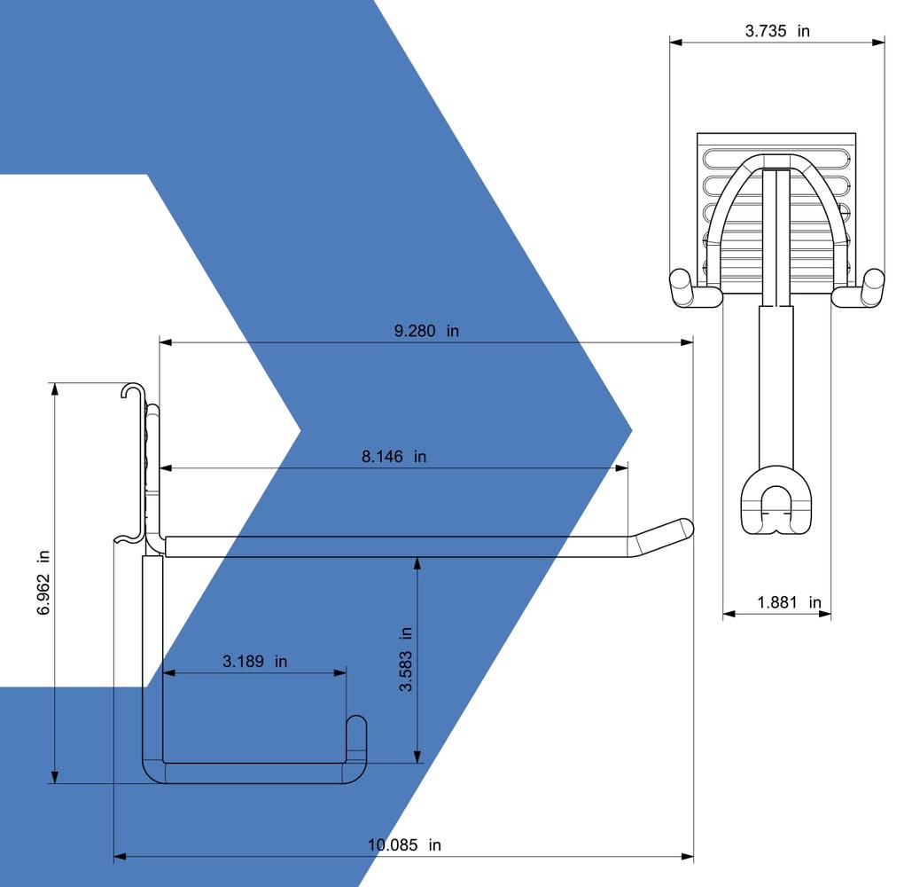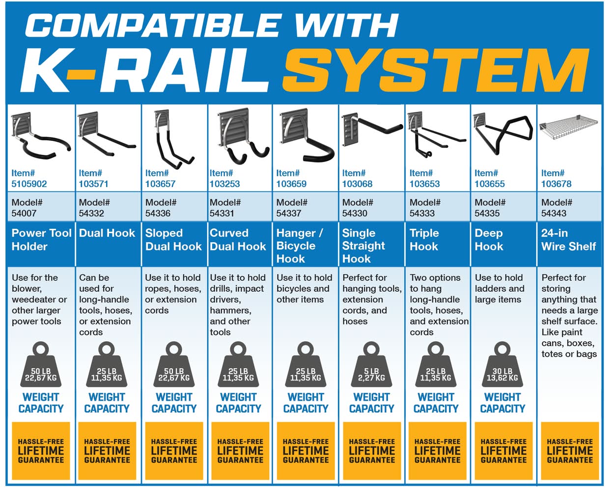Easy to hang and reposition on k-rail wall systems. Features a strong design. Holds up to 25 lbs. 5.9-in long. 2.95 in width between two hang points. Steel construction with protective vinyl coating. Great for use in garages or sheds to free up floor space. For CA Residents Only: WARNING: This product can expose you to chemicals including Lead which are known to the State of California to cause cancer and birth defects or other reproductive harm. For more information go to www.P65Warnings.ca.gov. Color: Gray