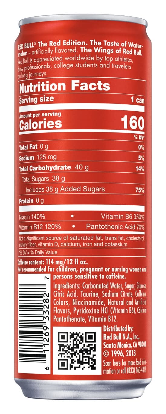Single 12 oz can of Red Bull Energy Drink Red Edition. Red Bull Energy Drinks formula contains high quality ingredients: Caffeine, Taurine, some B-group Vitamins and Sugars. One 12 fl oz can of Red Bull Energy Drink contains 80 mg of caffeine, about the same amount as in a cup of home-brewed coffee. Red Bull Red Edition Energy Drink is: Wheat-free, gluten-free, dairy-free, lactose-free, vegetarian. Aluminum cans are forever recyclable, without any loss in quality. Vitalizes Body and Mind. Red Bull is appreciated worldwide by top athletes, busy professionals, college students, and travelers on long journeys.